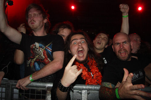 Instead we made it over to the Terrorizer stage just in time for Dragged Into Sunlight. Having amassed an obscenely big crowd (granted, I’m sure many in the room had never seen the band before), the scent of joss sticks at least made the ambience somewhat more pleasant. The last time I saw DIS was back in 2008 playing one of their first gigs on a most oddly paired bill with Gama Bomb and Bonded By Blood and it’s interesting to see that they have changed very little since then. There’s not a hint of sunlight on the darkened stage, everything appears kind of minimal the way the musicians play with backs to the crowd. Earth-shattering screams traverse the foundation of scraping guitars and menacing bass sound creating a feel of intensity and horror. Through their three song set including ‘Boiled Angel/Buried With Leeches’ I can’t help but feel that while musically they tick all the right boxes there is something I don’t quite connect with. Perhaps it is the lack of stage presence and visual focal point?