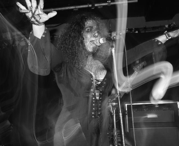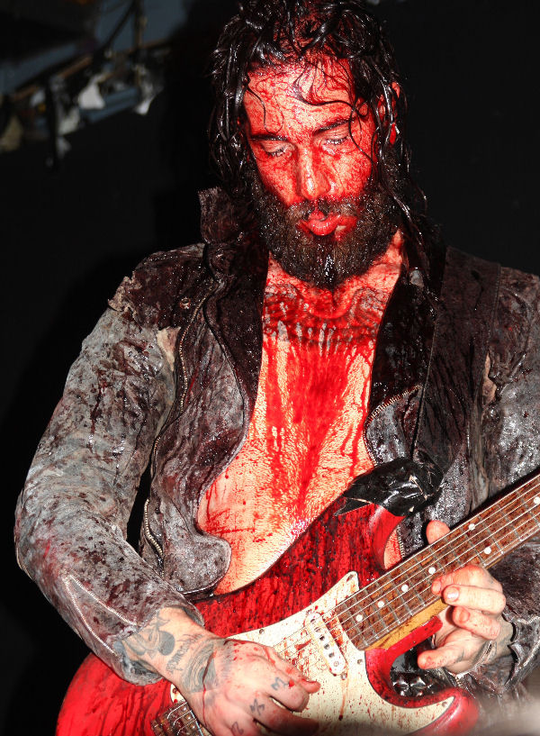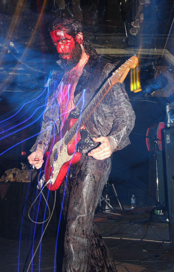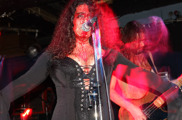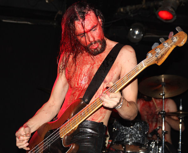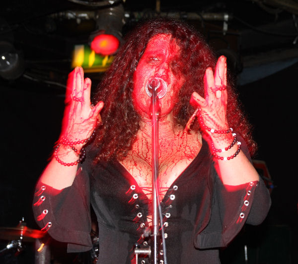 Whilst we were getting acclimatised to the scent and sight in front of us we were quickly borne ‘On The Wings Of Gloria’ and the gig, or ritual, a phrase that for once was remarkably apt was off. I at first thought they had skimped on the blood but then the camera caught the truth of the situation, sure the drummer could get away with things a bit but most of the band were a ghoulish delight looking like they had crawled out an abattoir, if you are in any doubt they do not use any fake blood but the real deal, and theatrically accept no substitutes to their Grand-Guignol display. This was not a case of playing just tracks off the new album and we were suddenly pitched back to 2008 EP ‘Come Reap’ with ‘River Of Gold.’ Riffs felt like they were flying straight out the 70’s and Farida’s vocals were perfectly pitched, highly strung and belting things out at the right points. The band itself flexed muscles and guitar solos spiralled out, dropping us into the musical heady flow and leaving us grinning with both shock and awed expressions on our faces.