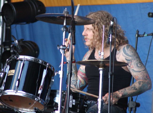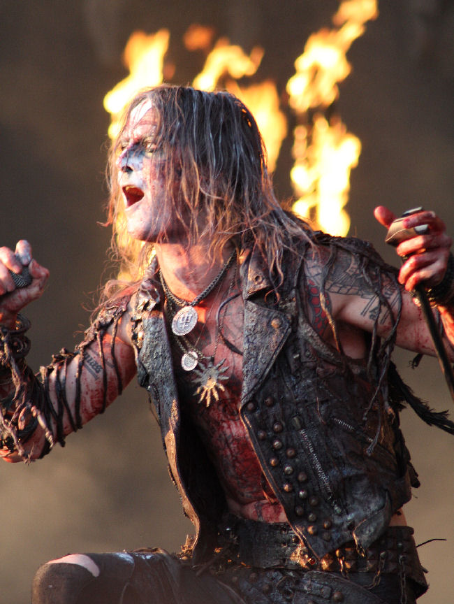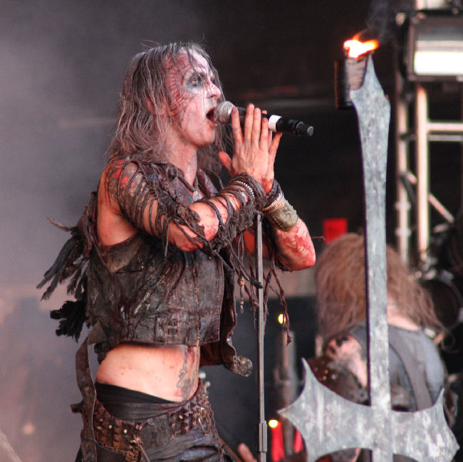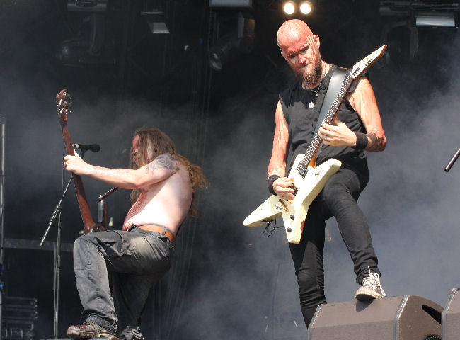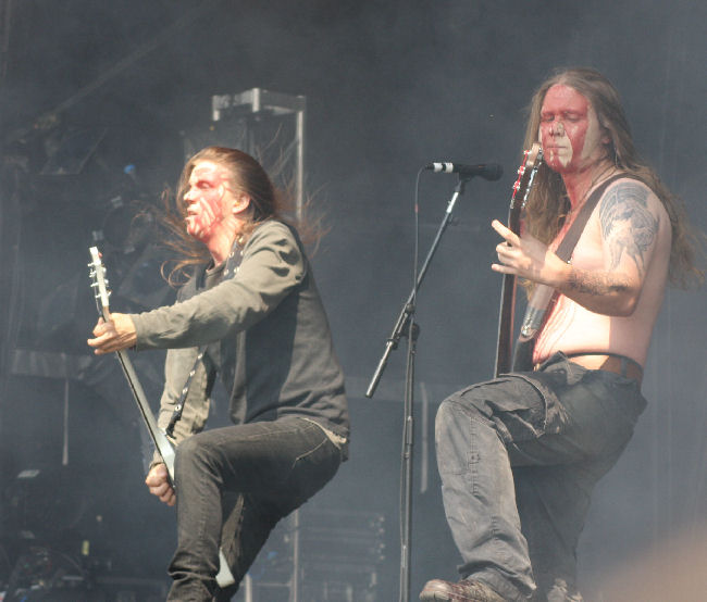 Caked in blood and warpaint, Moonsorrow transform the stage into a field of battle bringing their glorious Heathen might to the bill. On one hand, their drawn out numbers are hardly what could be deemed Festival Friendly, but nevertheless they always prove a hit. Truth be told, song-titles aren’t my strong point especially when all in Finnish, but ‘Kivenkantaja’ is one I did recognise with it’s beguiling Middle-Eastern melody which drifts airily along through storming blackened moments and epic, plundering riffs at times springing into a fiddle-de-dee jig. Their twinkly, crepuscular keyboard sound comes across well, and there is plenty of harmony flowing through their fist-pumping battle anthems. ‘Sankaritarina’ soars towards their final destination getting the crowd going with its ‘wooahhhhh’ clean vocal chants, and ferocious rasps. I do find them not quite living up to how I remember them from previous shows and today they don’t quite setting things ablaze, although still it’s a solid performance. (LH)