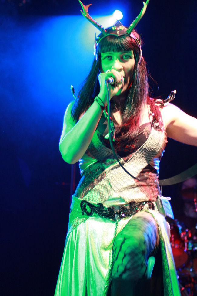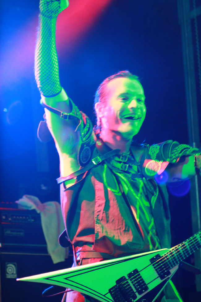 Next on the main stage was Freedom Call so I legged it coward that I am. Besides had heard that the oddly named Commander In Chief on the Sophie stage were worth a look. The Commander in case was actually an Italian born lady she was a bit of a guitar virtuoso as well as a singer. She was backed up by a drummer and equally flamboyant bassist and looked resplendent dressed up in a brightly coloured military jacket making sure nobody would question her rank. It was quickly established that her voice was one that was going to have no trouble hitting the rafter, as high up as they were. The operatic warbling was perhaps a tad uncomfortable even for those not with a high tolerance for such things. I was slightly reminded of a band I was going to be checking here lately Pythia but things were not gelling for me on first impression. The bassist was giving it his all and tearing around the stage enthusiastically but by the second number it was noted from our viewing point now near the back that there was a bit of a mass exodus from the tent. It certainly was a sound that was on the marmite side and despite the cut and thrust and enthusiasm I had to admit that the Commander had defeated us too although this was probably not the desired victory.