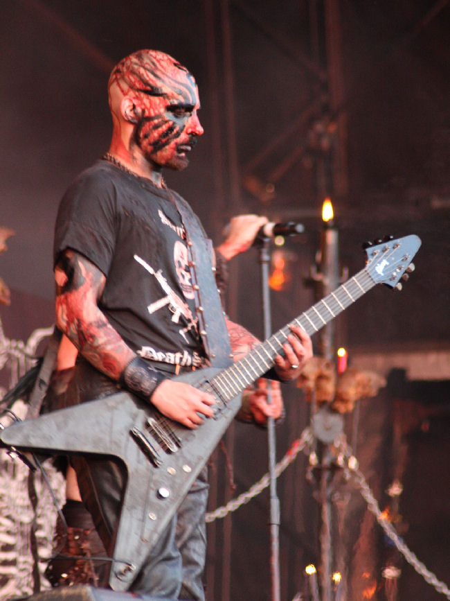For the next hour the Swedes completely owned this field and in my opinion were neither bettered or even touched all weekend. From the opening bombast of Malfeitor they stormed ahead with feral, savage and unrelenting intensity. I have witnessed the band about 10 times but this was one of the best and the sound was precise and clear as it could have been in fact I am hard pushed to remember a time I have ever heard such clarity for a black metal band certainly at a festival. Often you see people taking the piss out of bands who play such a genre and with the likes of some (Immortal and Dimmu take a bow it is hard not to). As Watain ploughed into Sworn To The Dark there was not a hint of this, it seemed treated with the respect it deserved and I think any detractors had scuttled off tail between legs looking for other lesser gods to worship. Brimstone and flame were part of the ritual, there were massive hellish explosions as dusk turned to dark and it is surprising none of our cast combusted along with them. Although E was very much the focal point and raged and ranted and flung himself around the rest of the fleshed out live band could not be ignored. Set with his peculiar make up particularly looked demonic and Pelle’s corpse paint an equal work of devilish inhuman design done in a way that actually would frighten small children (and quite a few adults) rather than looking comical. We got some great numbers such as ‘Total Funeral’ and ‘Reaping Death’ and we were wowed by the sheer blazing incendiary show as a whole. One thing I would not have expected was having last number ‘Waters Of Ain’ played in its entirety but it worked fantastically finalizing a rather special set. One complaint! Well they could have got Carl McCoy out to do his part (only joking).
