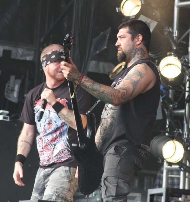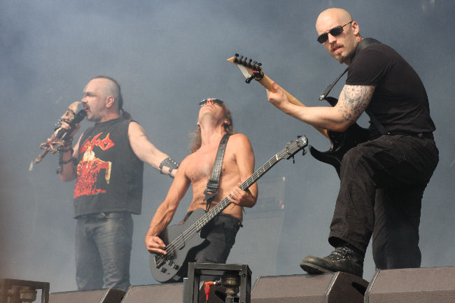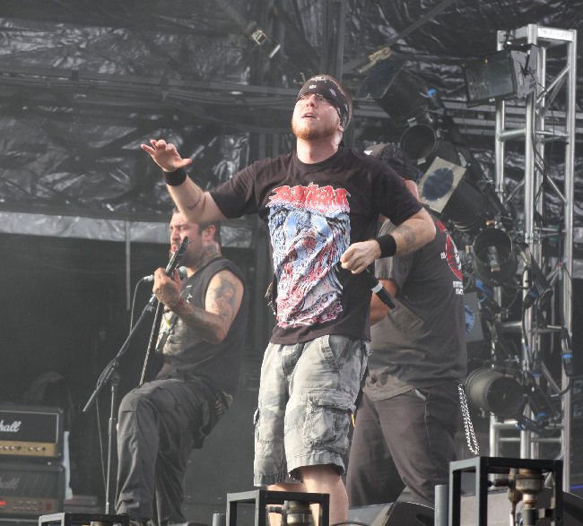 Napalm Death have this year off so it’s the turn of the other Brummie brutalists Benediction to open the main stage today. It does seem as though one or the other is guaranteed to play the festival each year, not that we are complaining as this is just the wake up call we need. Whoops whose had an accident, Dave Hunt playing the first of two sets of the weekend hobbles on stage on crutches and perches himself up, leg on monitor before shrugging it off and stating that you “just get on with it don’t you?” They do this in style with ‘Nothing On The Inside’ and have absolutely no problems in whipping up a pit circle from the off to which I have to will Dave not to jump in and join in. The somewhat cooler and more overcast weather is a bit of relief and allows more rigorous action and ‘Unfound Mortality’ goes off like the clappers getting heads banging and necks snapping in time.  As for the punk laden swagger of ‘Suffering Feeds Me’ it rocks us around and rolls over us like a bastard motorcunt. Solid stuff from these death metal stalwarts, follow that! (PW)