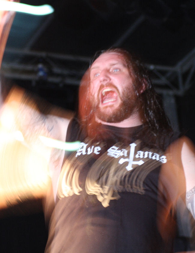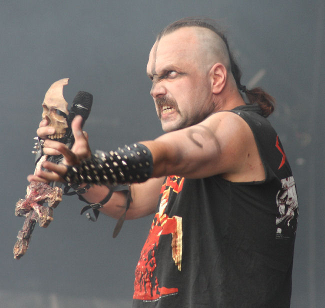 No doubt the question on everyone’s mind prior to Mayhem was what’s Attila going to be wearing? Well nothing! No I don’t mean that literally though he had no costume on but was simply being his metal self today. He did explain to me later in the bar (no doubt whilst wondering who the nutter with a chain of daisy’s on his head was), that people tend to expect it and it’s nice to occasionally surprise them by not doing so. So from the marching familiar intro beat of ‘Silvester Anfang’ it struck as a stripped down performance in more ways than one. It played out in a fast and furious fashion with songs like ‘Deathcrush’ taking us right back in time. Although looking normal Attila neither acted or sounded it. Clutching the remnants of a skull it was as though he was taking things to Shakespearian excess as he croaked, spluttered, squealed and grunted through his parts.