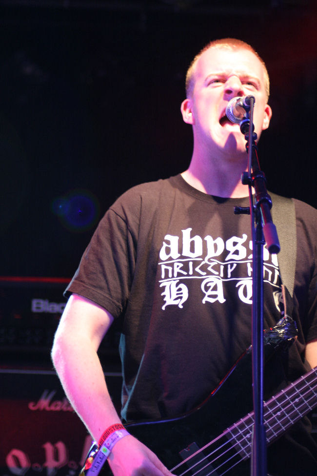 Bloody hell every photographer on site must be in for a look at Dripback, rumours of them being such ugly freaks must have spread.  Their music matches the look, ugly is a great description and as for what is expectantly waiting in the wings behind us in the crowd it looks like only the strong are going to survive when they explode into action. So a year has passed since they last assaulted us on this very stage so what has changed, have they improved into a precise metal outfit. Well no and there would be little point in them doing so as their charm is all about delivering abrasive, short sharp and shocking riots of noise which they do admirably. Playing a mix of their old EP and new soon to be released Russ Russell produced debut album they quickly have the crowd primitively kicking seven shades out of each other as they jump around the stage, pull grimaces and shout out riotous statements like “let’s smash the crap out this place,” which they pretty much do. Dripback deserve being sent somewhere extreme and obscene inEastern Europe, if we are lucky they may even keep them there. At the bar Luci is getting a much needed drink as the band shout out “whose got our record then?” Cue reply from barmaid at top of voice “nobody you’re shit!” Safe innit. (PW)