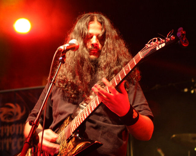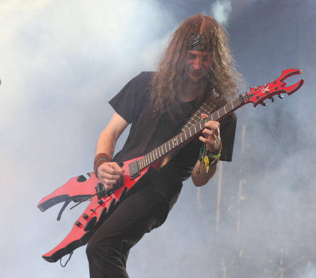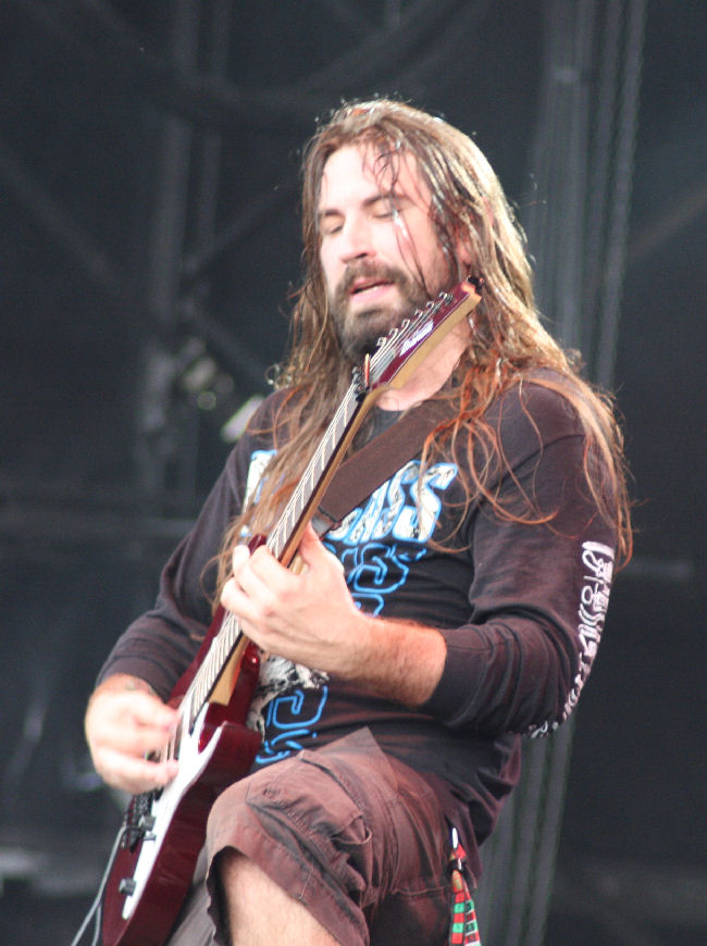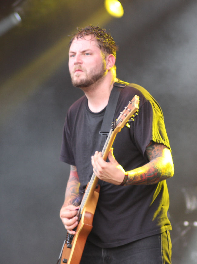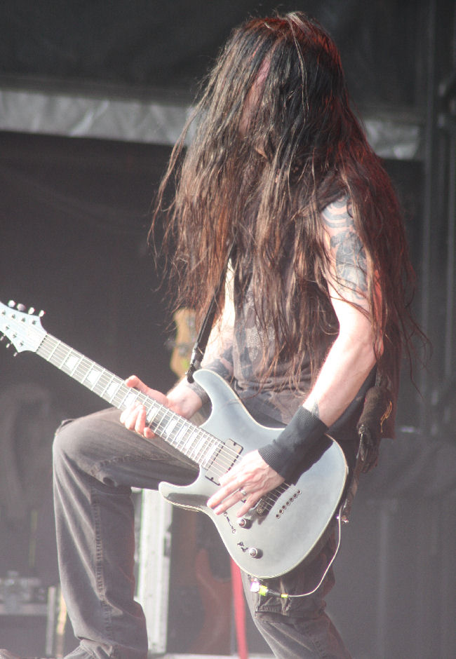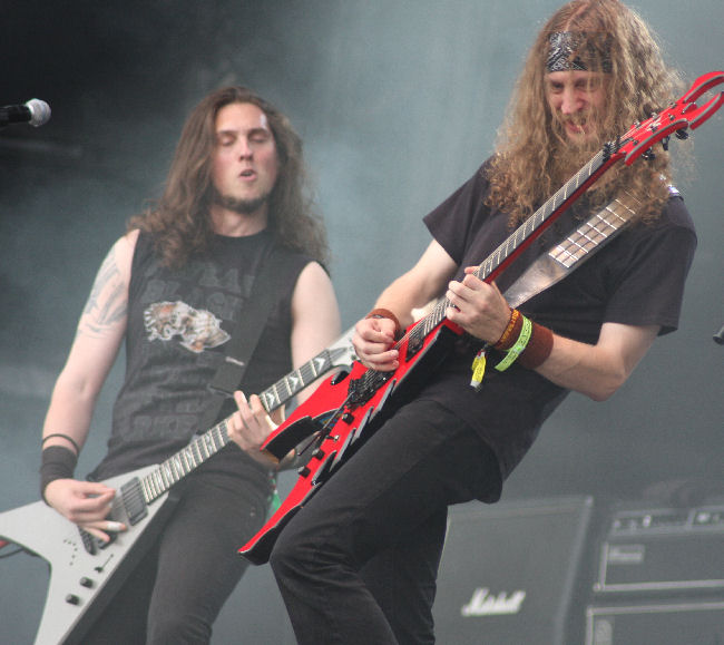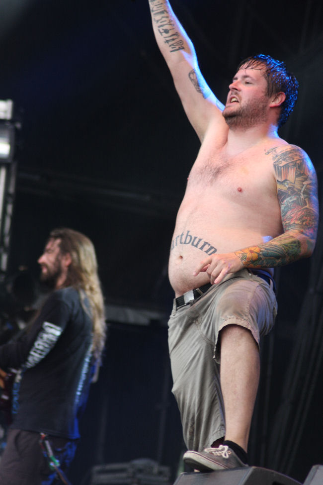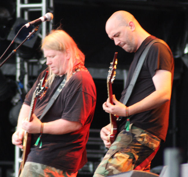 The gods were obviously not happy as the sky went overcast, a wind whipped up and we were lashed with the rain stick as Nile came on stage and set about offering their ‘Sacrifice Unto Sebek.’ It has been a while since I have caught the band live and must admit I had after the first few times found them incredibly formulaic and not that exciting to watch. A couple of albums had left me feeling in need of something a bit more too but I found that in new one ‘At The Gates Of Sethu.’ Live here they were powerful and surprisingly in between songs quite full of banter, going as far as laughing at the great English summer weather. However they are still a pretty damn static band when it comes to any sort of onstage movement and remain quite rooted to the spot. Bassist Todd Ellis is new but the ever present Karl Sanders is the rock that has kept the band transcending the aeons and making them one of the most revered forces in death metal these days, something all here seem to appreciate. It’s an all too short (unlike some titles) seven song set with just seven songs cleaved out including one from the new album. ‘Black Seeds Of Vengeance’ is the one it seems most are waiting for and is a fitting denouement to the set. (PW)