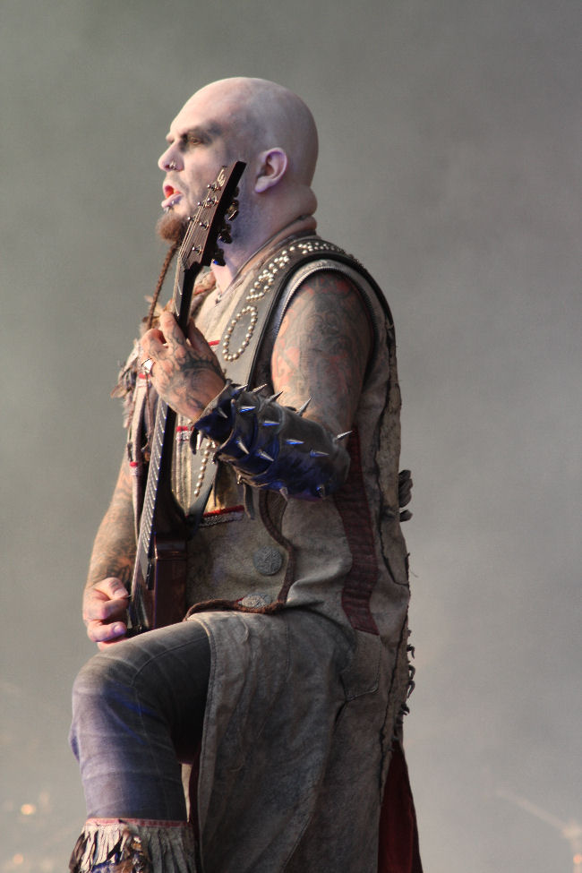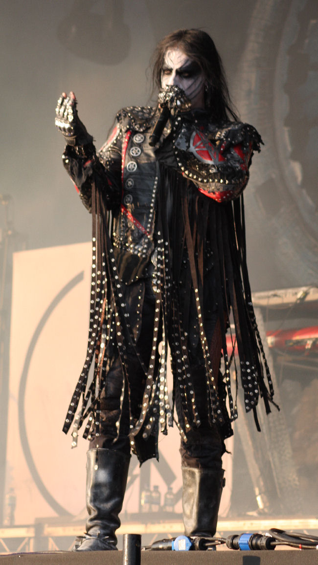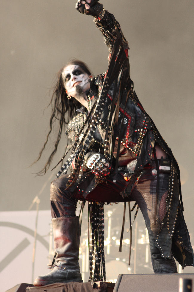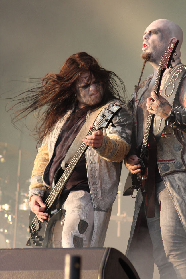 Spreading out three big name black metal bands over the three days on the main stage was a good move and today it was Kings Of Pantomime Creation Dimmu Borgir’s turn. Yes as much as they try and tell us how true their style of Norwegian Black Metal is compared to the likes of Mayhem are you ever going to take a band with such silly costumes, pompous songs and sense of trials and tribulations within their line up that seriously? I admit that I have not gone and bothered with last album Abrahadabra, the name itself had me saying no but I hoped I was still going to be able to enjoy them live. Yes, well it is rather impossible not to, especially as they look so crazily resplendent and today seem to capture the shots like no other bands have managed, despite billowing clouds of dry ice. Shagrath is the loon at the front with enough tassels hanging off him to whip a nunnery to death and then there is Galder the Old Man’s Child and Silenoz both on guitars. As for the others on the stage, well we don’t mention them OK.
