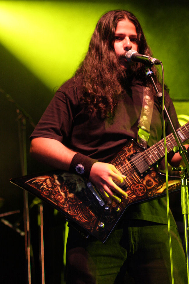 Demonic Resurrection have come all the way from India, they were meant to make it over before if memory serves well but things went tits up, no doubt due to Visa related problems. It would have been rude not to pop over to the Sophie stage and watch them and many were commenting later that they were the surprise of the festival. Being already well versed in last album ‘A return To Darkness’ I was intrigued to see what they were like in the live arena and was not alone as many came in to watch the band. With symphonic black and death elements their music is quite varied and their ‘Unrelenting Surge Of Vengeance’ certainly goes down well. The band are obviously overjoyed to be playing in the UK and want the audience to make some noise as the show will be watched by many fans back home in India. I feel a bit guilty that I won’t be able to make their follow up performance at the Unicorn inLondon after this even if I was again surprised at the inclusion of clean vocals in their songs. Somehow it all works well within their sound though and hopefully this will not be the last time they are able to make the trip over to play inEngland.