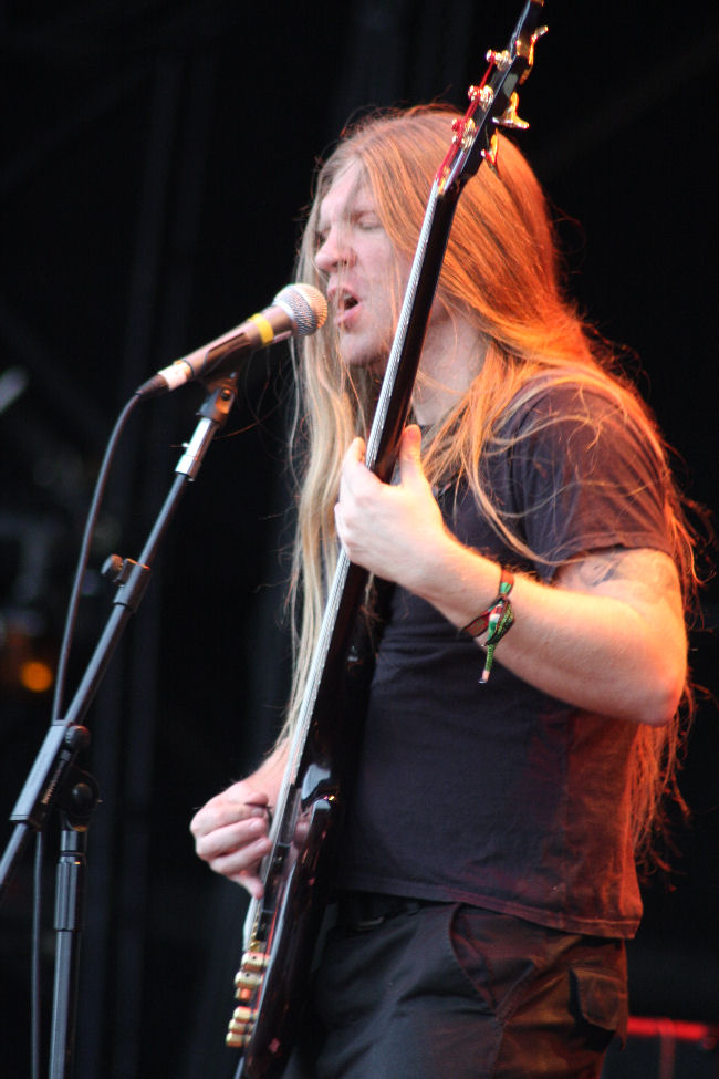 Appear in the bright sunshine on the Sunday afternoon, when all but the most hardy of festival goers are feeling their spirits and bodies cracking under the pressure of non-stop metal, terrible food and warm beer. For Paradise Lost we see that Nick Holmes, ever the stereotypical Yorkshireman, is in dry mood. Every time he mentions “Bloodstock”, there’s a slight wry smile on his face, as if he is revelling in the silliness of it all. Over the last few days, we’ve all experienced various bands with their own shticks – make up, costumes, themes. Paradise Lost have strode onto the stage in simple black attire, the very epitome of self confidence and effortless style. Sure, some may complain at the relative weight of songs taken from their latest (great) album, Tragic Idol, and it’s also telling that while the tracks from Draconian Times get the biggest cheer. Each song is played flawlessly of course – though Nick Holmes appears to put on a very strange higher pitched voice for the most recent tracks, and it’s always a joy to watch such a solid rhythm guitarist in Aaron and a solo guitarist with such a distinctive tone as Gregor. Still, there are no tracks from before Shades of God, and none at all from Icon, which seems completely bizarre in the same year that they have released a “best of” compilation. Still, Paradise Lost came to amuse, and this they did. As Holmes himself dryly intones, “one wouldn’t want to be a cunt, would one?” (CD)