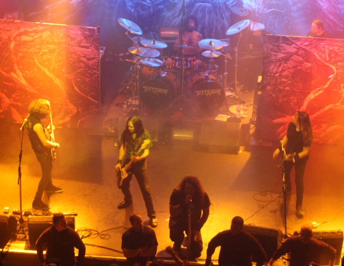 I entered the venue minutes before Malefice started their set, completely missing the opening act of the evening, Xerath, as I had no idea proceedings were to begin so early, with Testament hitting the stage at 8.15. Now back to Malefice. They put on a pretty good show, with the band being as energetic as their music. Vocalist Dale Butler did point out a couple times that he was appreciative of the fact that everyone was at the gig to watch Testament, but thankful that they were being pleasantly tolerated rather than bottled off stage, in not so many words. Style wise they are an energetic thrash/death hybrid with rather melodically shouted vocals rather than death growls or old school thrash vocals, even though they both do appear from time to time. Ben Symons and Andrew Wilson’s guitar riffing is solid and heavy, yet interspersed with harmonics, squeals and squawks along with leads they played with a certain amount of flair. Every now and then Tom Hynes would slap his bass to create a pop/rumble in the bass bins that could be felt through the floor and walls. Chris Allan-Whyte kept changing the drum patterns from blast to off beats then heavy snare pounding mayhem, keeping the guitarists on their toes. All in all, not a bad set, but we all knew they were going to be the cannon fodder for the evening ’til the real show began.