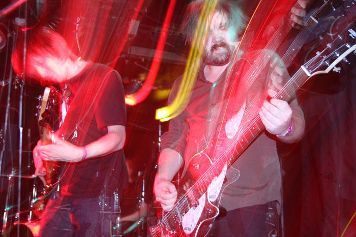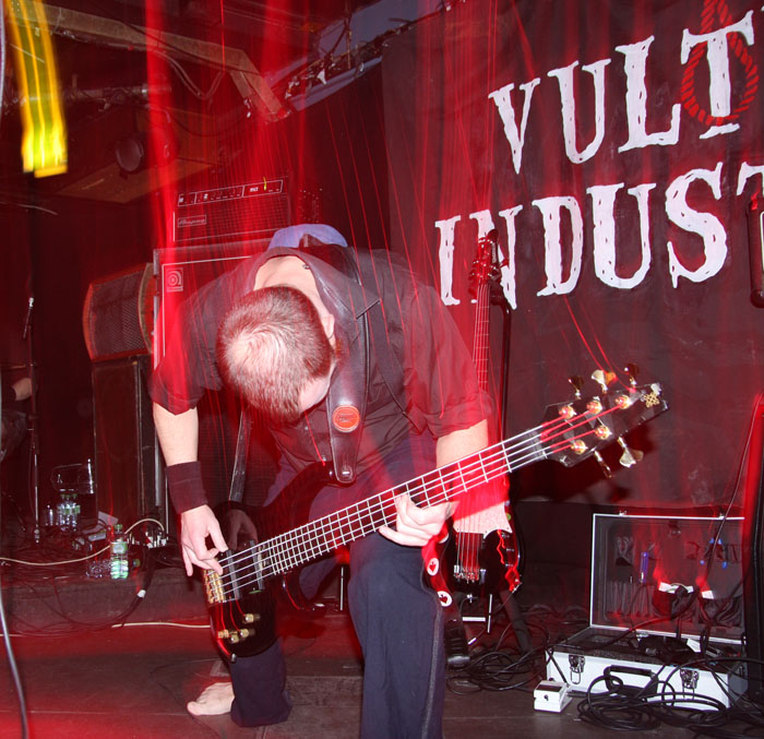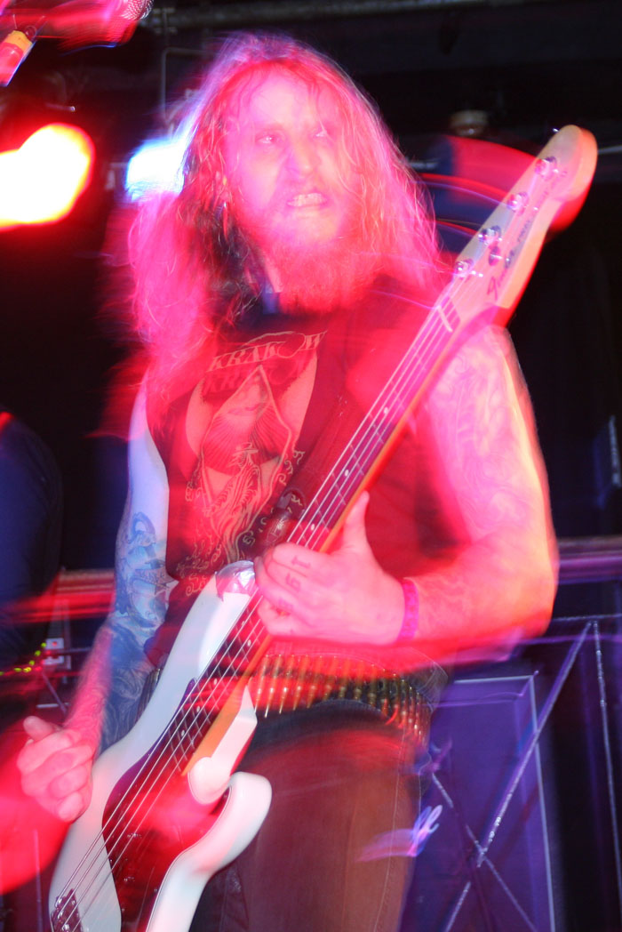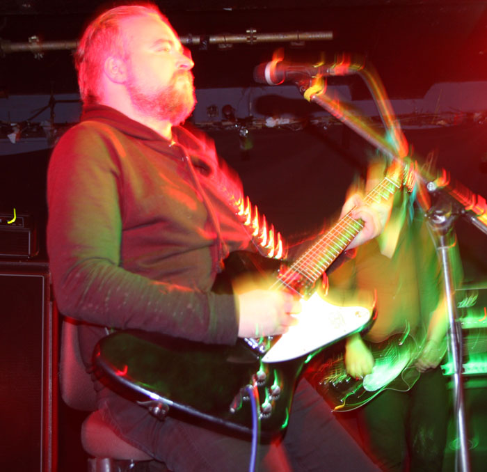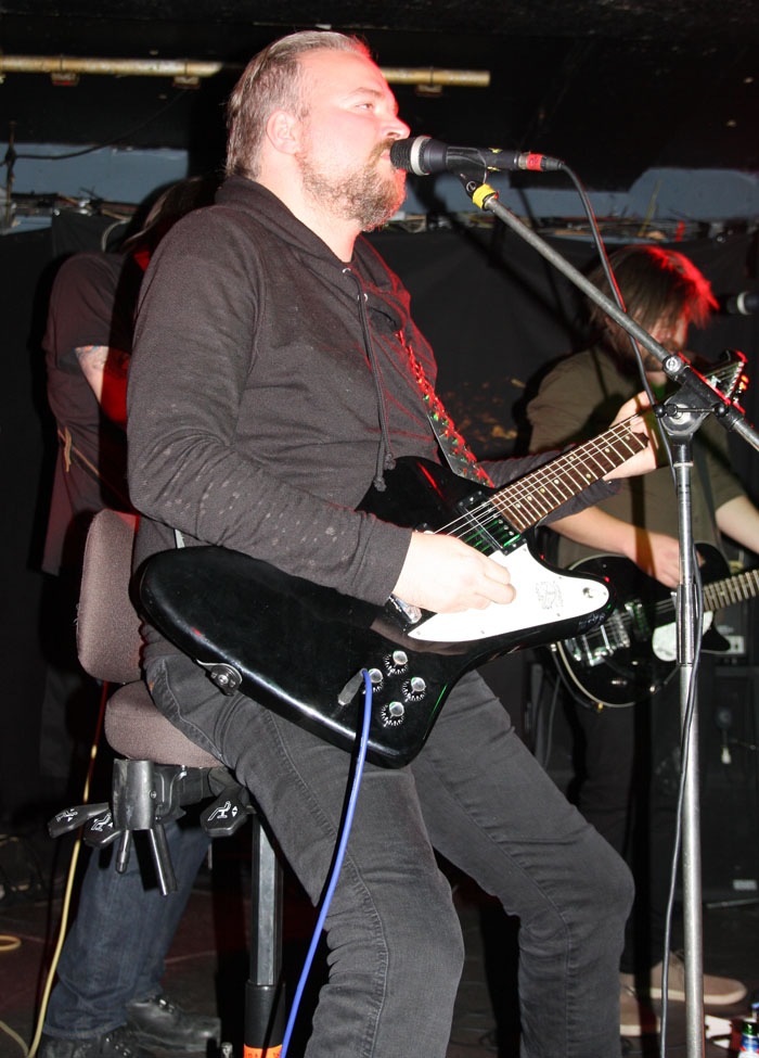 I was on last legs, this Virus was gripping hold but luckily the band did not keep us waiting too long to make an appearance. Obviously there was never going to be any dashing around the stage from Carl-Michael Eide aka Czral aka Aggressor (getting along with Aura Noir his second review today). He was sat on his stool to sing and play along whilst it was left for the rest of the band to stand around him and add to the thick set strumming sound that was identifiable the second they swung into things. The bass tones were great and in fact the clarity of the sound through what I caught of the set was fantastically pronounced and defined. The group made it sound completely effortless as well as they jived about on stage and laid things down. A small roar of applause and recognition met old Carheart cut ‘Be Elevator.’ The convoluted gyrations hit the mark and had heads nodding appreciatively as this was true innovative stuff following on from the style created by Ved Buens Ende before them. Sure there maybe others who touch upon it, at times I was reminded of Dutch band Kong and some of Jim Plotkin’s latter Old here but this lot really put Norwegian avant-garde on the map. There was a new song, it was instantly identifiable again by sound giving off a seasick swagger like being in a small boat and tossed about on unruly waves. You would not want to be gripped in a fever and feeling sick listening to this, unfortunately…. ‘Chromium Sun’ injected things with verve and vigour with everything going up a notch including the vocals and Einar Sjurso’s tribal drum bombast. Those around on the dance floor had plenty of space to move in and jerked away spasmodically caught in the grip of the riffs. I am afraid that was pretty much it for me, not one to leave a gig early or for once be forced to sobriety for it I was forced to cut the set short in hope of fighting another day. A very enjoyable show all round though even if those pesky vultures plucked the flesh from the bones of the other bands by a margin tonight.