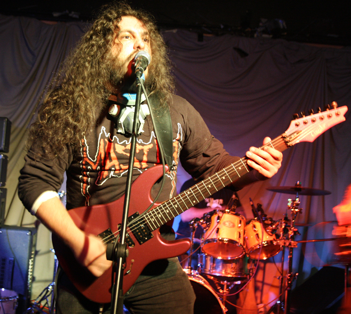 I should really have caught Decrepid before but don’t think I have. I do quite often see their “Live at The Purple Turtle” album cropping up on a well known Internet auction site but had no real clue as to what to expect as the band took to the stage. At least they were slightly different not being just a trio and they really filled up the stage but it was evident that the imposing bald singer Cris was going to be the focal point. After tuning up with some classic Sabbath vocals they moved far from that comfort zone with chundering vocals like sewage sliding down a drain, abrasive and jagged riffing and a lot of grind mixed into their deathly backbone. The words chunk and chewy sprung to mind and were kind of a good fit and although this was quite abrasive it sounded damn sharp and was delivered incredibly tightly. The two guitarists fleshed things out and bass definition was nice and thick. They obviously had some fans here too and as I attempted to get some shots I was getting whipped by Hackney squat crustlocks. Unfortunately a good part of the set was spent queuing to get a drink but I could still certainly hear what was going on very loudly and came to the conclusion that this lot could have picked the name Napalmcorpse and suitably got away with it. Their brand of pummelling goodness was dynamic, tight and precisely delivered.