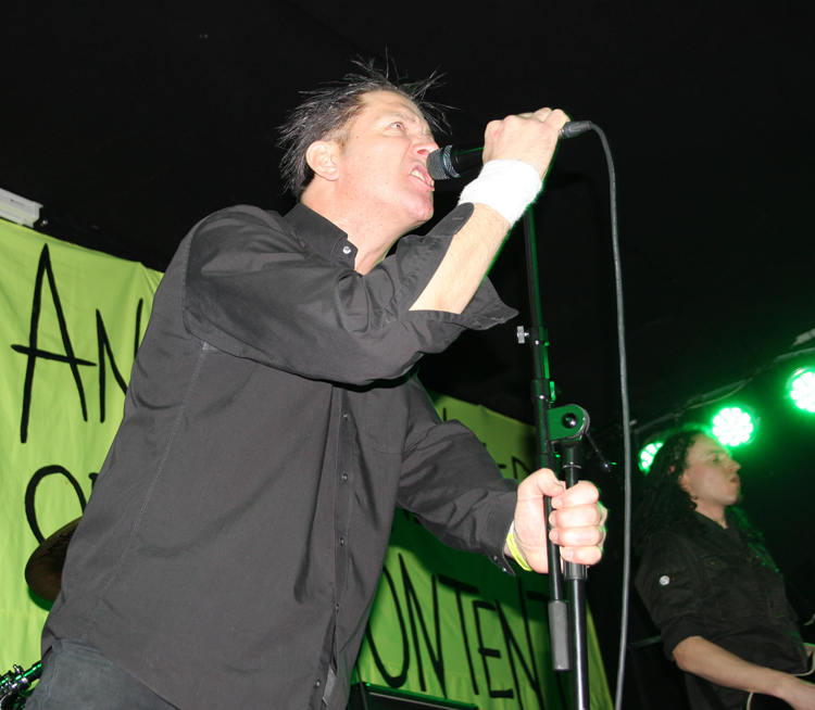 Anyway having been away for a while one could have expected rock star pretentions and an audience being kept waiting on a leash but no, the band simply took to the stage without any rigmarole and flew into things. Punk can be as I said before all too familiar and too safe or even have an annoying sense of humour about it but not with this lot. Conflict are the real deal, the danger, the aggression and the in the face controlled power that hits like a brick. The black shirted band looked grounded and sounded good and the audience reacted with everyone suddenly wanting to be in on the action and down at the front of the stage. The fluttering guitar sounds were caustic and instantly identifiable as being owned by Conflict despite the player being new to the game. The message was clear nothing has changed and this was all about going From Protest To Resistance and it sounded meaty as a fist in the face.
