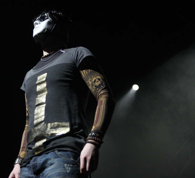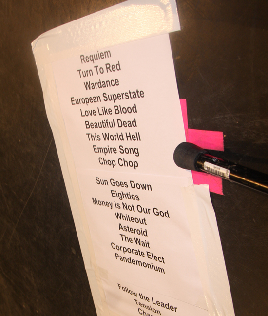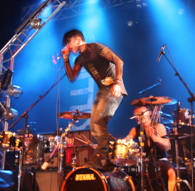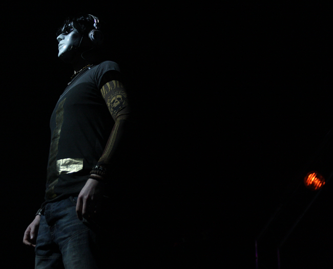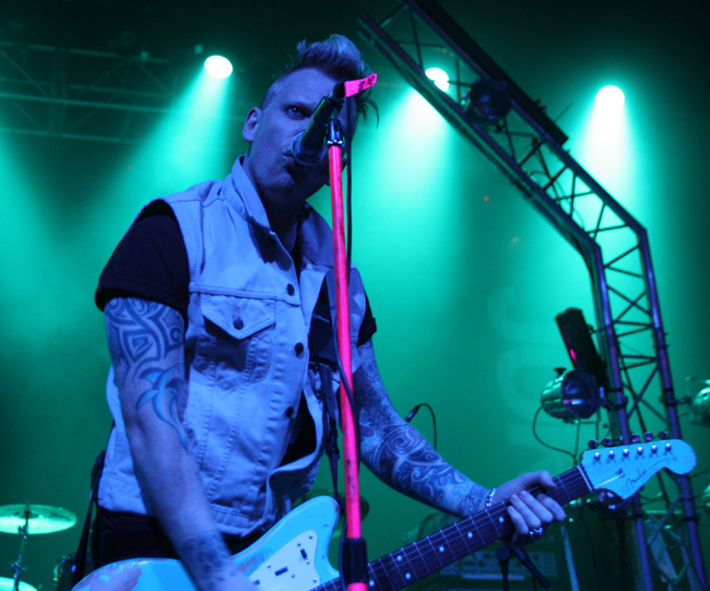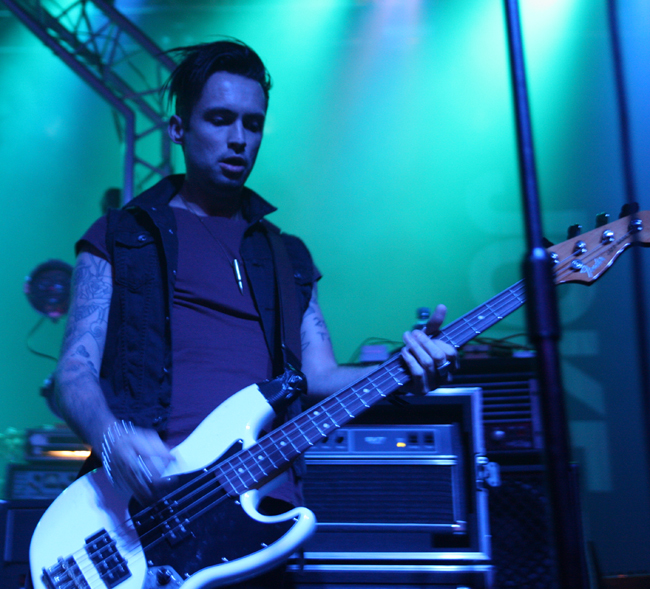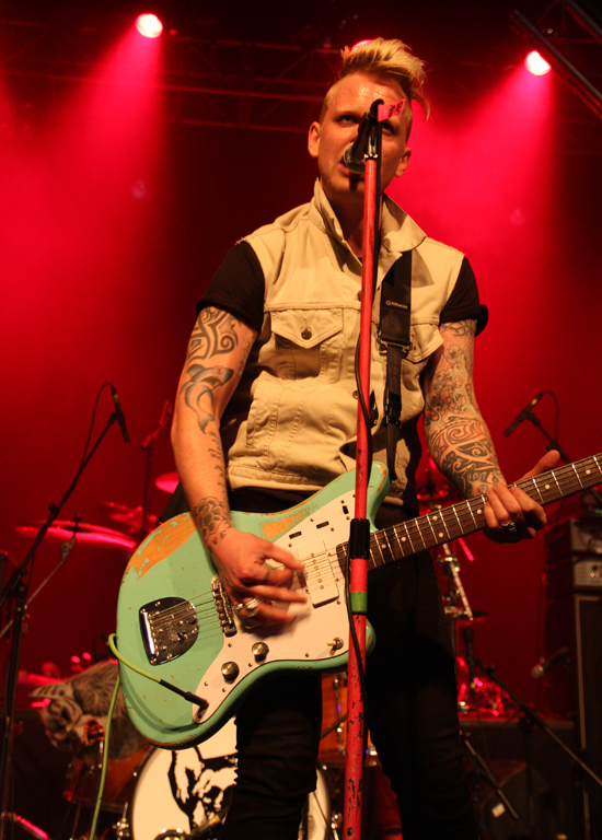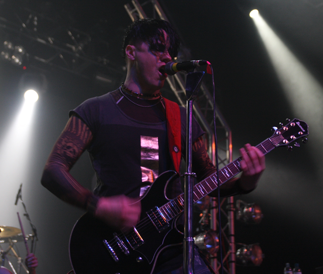 Jayce Lewis is the sort of name that I would have expected to crop up on the X Factor singing R & B covers but luckily the somewhat egotistically named act were far from this. Forget everything that I said about posturing before these Welsh boyos had their own over the top light rig and posing platforms and were all about the showmanship. Apparently the singer who is a solo artist when not live also manufactures his own set production so credit where it’s due. They played as though they were there supporting the best band in the world to which for many of us they were. Firstly coming on in masks and whipping them off and blazing away with some cutting edge electronic sounds which although never hitting gabba like intensity at times threatened to do so. Slower songs had a bit of a retro feel to them and again I found myself thinking that this lot would have done well to open for Depeche Mode or Gary Numan. Faster numbers had adrenaline coursing through them emphasized by the vigorous stage display and heady electroclash of sounds. Not everyone liked them and one over ambitious punter launched a pint at them, unfortunately it fell short getting me and my camera completely drenched in the photo pit. Hazard of being there but at almost £4.50 a pint also sheer madness. Again this lot pulled it off and did so to a much bigger crowd, apparently the Welsh side had just won the rugby too so they can chalk this one up to a totally successful day.
