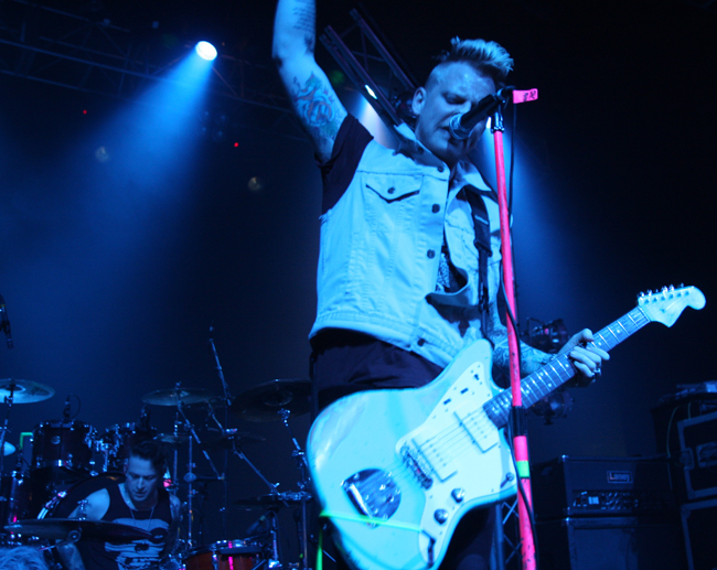 Checking out both the support bands before the show I decided that they certainly warranted a look and further investigation rather than spending time hemmed in with the multitudes in the local pub. It meant that Hounds who had the job of being first on were not playing in front of that many people but it certainly did not stop them throwing themselves into things as opening number ‘Shark In The Water’ bounced out the speakers with a heavy electronic bombast pulsating through it. First thought about this was that it was all very meaty, beaty, big and bouncy and the front trio matched it up with some heavyset posturing and gobby attitude. The lead singer reminded a little of a young Kirk Brandon but musically this was far more modern and this was yet another young band that the Joke had brought out to try and impress their fans with. Hounds were not doing a bad job either and seemed to be going down fairly well with those entering the venue. I would have said that they would easily have pleased anyone into the likes of Marilyn Manson or Nine Inch Nails who they both resembled at times as they powerfully chugged away being just on the right side of being non- commercial and slightly threatening. With some touches that would have held their own in a stadium allowing audience sing along this lot have the potential to go far and in my opinion would go down really well opening for the likes of The Prodigy. Last song ‘The Wicked Witch’ was particularly quirky and catchy so an enjoyable half an hour all round.