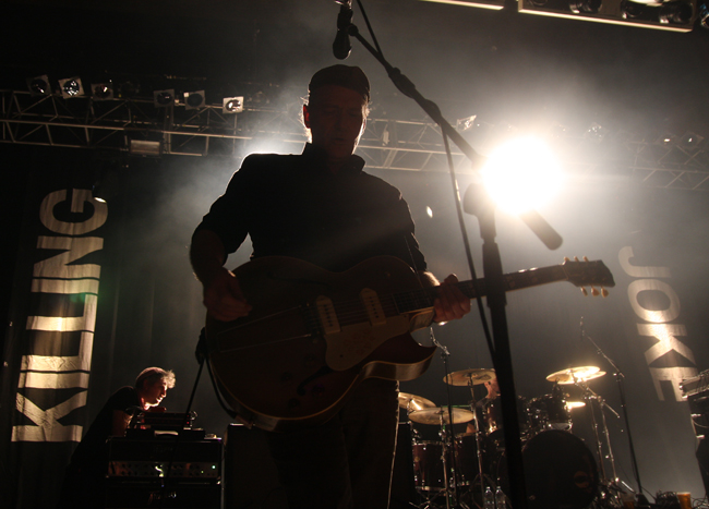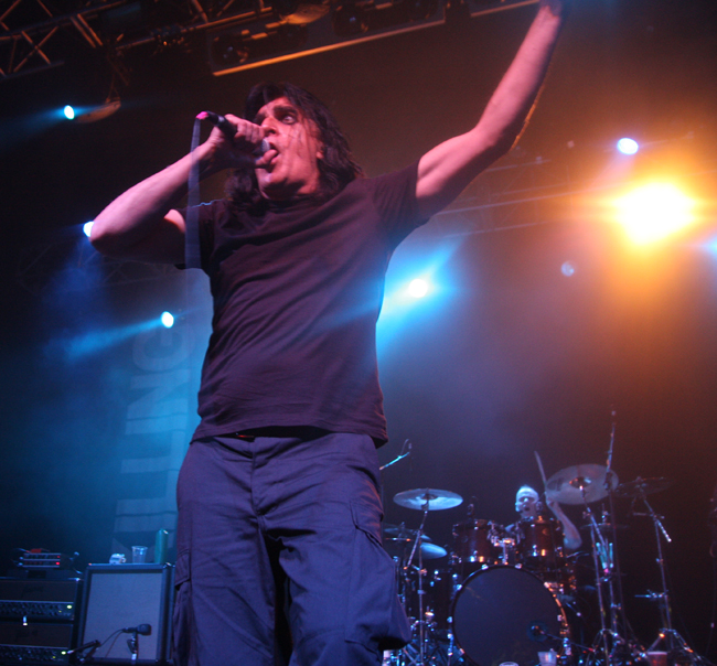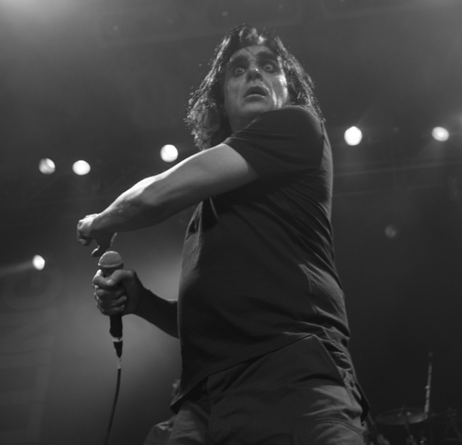 Killing Joke have of late been quite high profile, a couple of albums and plenty of shows and of course some disappearing acts keeping people as ever intrigued about the cult of Jaz Coleman. Had their popularity waned at all though? Not looking around just before they took to the stage as by now the venue was rammed, if it was not sold out it was as close to it as possible and the upstairs section looked equally thronged. Listening to conversations was interesting, fans really are fanatical and I overheard one person telling another about the first time he saw the band in 82 when he was 15, this is very much dedication for life with no parole! After all the stage dressings of the last lot Killing Joke simply had two side banners splitting their name at the back. Their death and resurrection show is not about anything other than the music and the stage was stark with no trappings. Jaz was in the centre and Youth and Geordie either side with a vast void between them all. Anyone would think the band members hate each other the space between them. Behind slightly is keyboard player Reza and of course keeping the beat at the back Paul Ferguson.