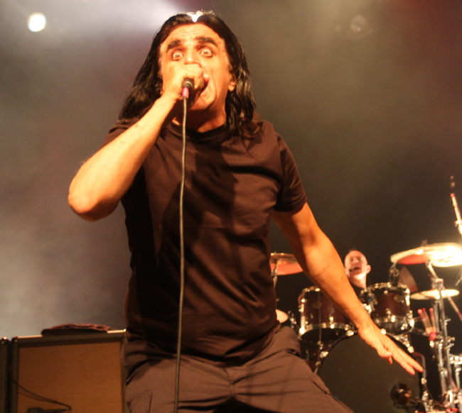 Jaz seemed quite chirpy tonight, speaking between songs although not wasting any time. He attacked the current trend of plugged in technology taking control of society and turning all into mindless zombies before the somewhat unexpected funeral dirge of ‘Beautiful Dead’ rumbled out the speakers like a requiem mass. A couple of downbeat slower songs gave us pause for breath before the frenzy really kicked in with ‘Empire Song’ dredged from the primeval swamp. With the rioting still fresh in memory this is still incendiary stuff which literally took us straight back to square one and ignited the flames once more. Screen projectors either side of the stage gave us plenty to watch as flames flickered and images constantly changed in a fast edited blur.