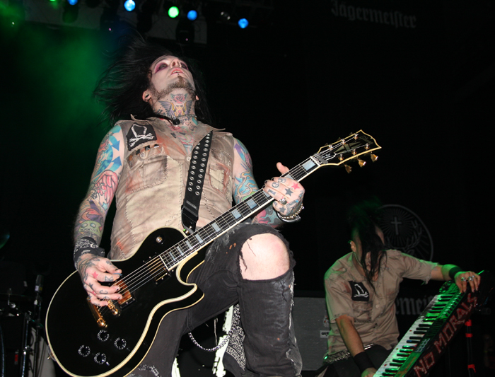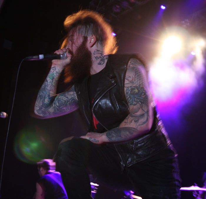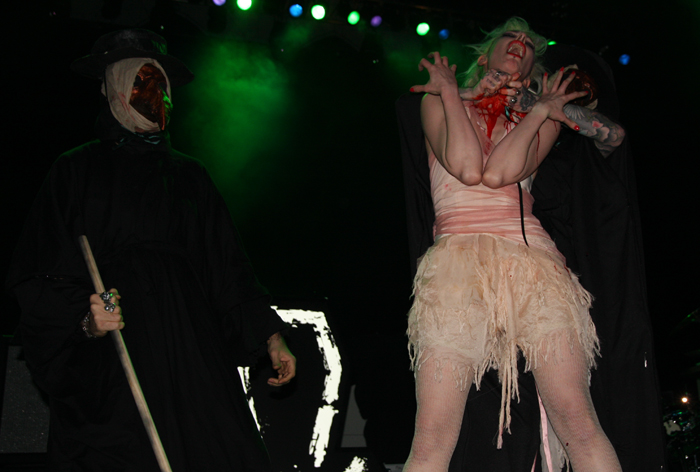 Ok I had seen The Defiled before and although again not my thing musically was aware that they put on a highly charged show. Tonight we were told we could flash them (photo wise) and stay in the pit as long as we wanted, so nobody can blame this band of having rock star pretentions even if they look the part and have just signed to Nuclear Blast! The Londoners were playing to the home crowd and were determined to make the most of it. Musically there is a bit of core, a touch of glam and a hint of sleaze and it is all wrapped up in an electronic backbone courtesy of keyboard player / singer The AvD who wields his instrument about with the dangerous prowess one would expect from a guitar player (guitarists were naturally doing the same thing). The crowd behind obviously knew songs like The Resurrectionists as they were singing along word for word having a great time of it. The band were posing and making the most of the big space at their disposal and I was happy to hear that they were doing a song about the ‘Black Death.’ I was not prepared at the show we got with it as mask wearing torturers did rather nasty things to a hapless lass, well look at the pictures for more on that. The song was not bad too and the fast paced edgy shock rock of the band was winning me over, the much better sound helping no end. By the time they had finished with a final ‘Call To Arms’ call me entertained if not a fan. I could see this lot going down a storm supporting the likes of MarilyNiNRammstein that’s for sure.