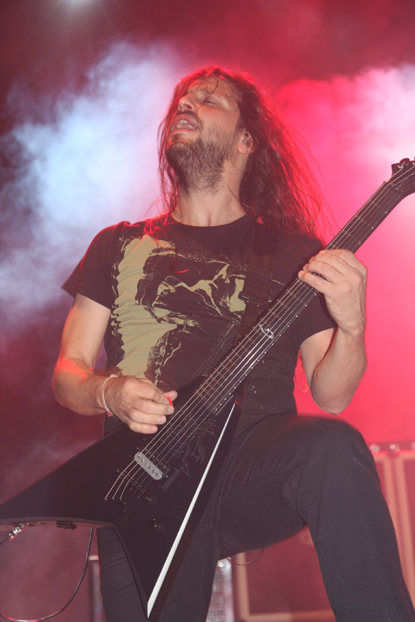 It’s been a while since I last caught up with Gojira which after this evenings jaw dropping set I have to say I am somewhat ashamed about. For many it was obvious they were the main event and after taking some (flash again allowed) pics there was no room to move in the venue. To say they exploded on the stage with a pulsating mass of ‘Explosia’ would be an understatement. The big head from cover of latest album L’Enfant Sauvage made an imposing backdrop behind the pulverising blur of drummer Mario. This was heavy stuff like being landed on by a ‘Flying Whale’ it would have made the unsuspecting blubber at the intensity of it and wrapped up in what can only be described as crystalline sound it was a case of live music does not honestly get much better than this. Singer guitarist Joe Duplantier roamed around fixing the audience with intense stares and bassist Jean-Michel Labadie literally launched himself in time with the music’s most intense rhythmic thrusts, doing big leaps across the stage. Certain songs were obvious big favourites and I was pleased to get the full weight of ‘The Heaviest Matter Of The Universe’ which definitely came across as described. This is one of those gigs that if you missed well you should kick yourself but redemption is at hand as we were told (well the cameras made it obvious) that the whole thing was being filmed for a DVD. They did it in one big fuck off take too, nothing needs adding from what I witnessed. They even got away with a drum solo and the drummer took his turn at doing vocals matching his brother confidently with a more deathlike roar. Visually it was just as epic with the music reaching fever pitch and the head being projected upon with a dizzying collage of images. ‘The Axe’ delivered a hefty blow and the final breath-taking mass of ‘The Gift Of Guilt’ completed a storming show. This was headline festival material in my mind and obviously many others agreed as although not emptying the venue after it did get a lot thinner on the ground.