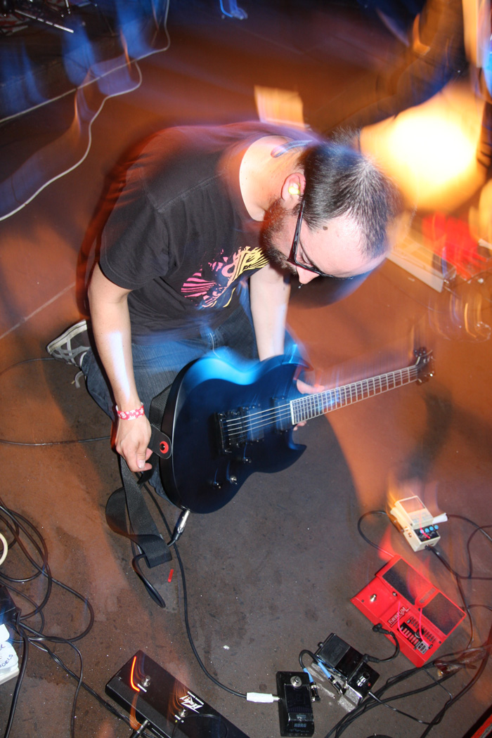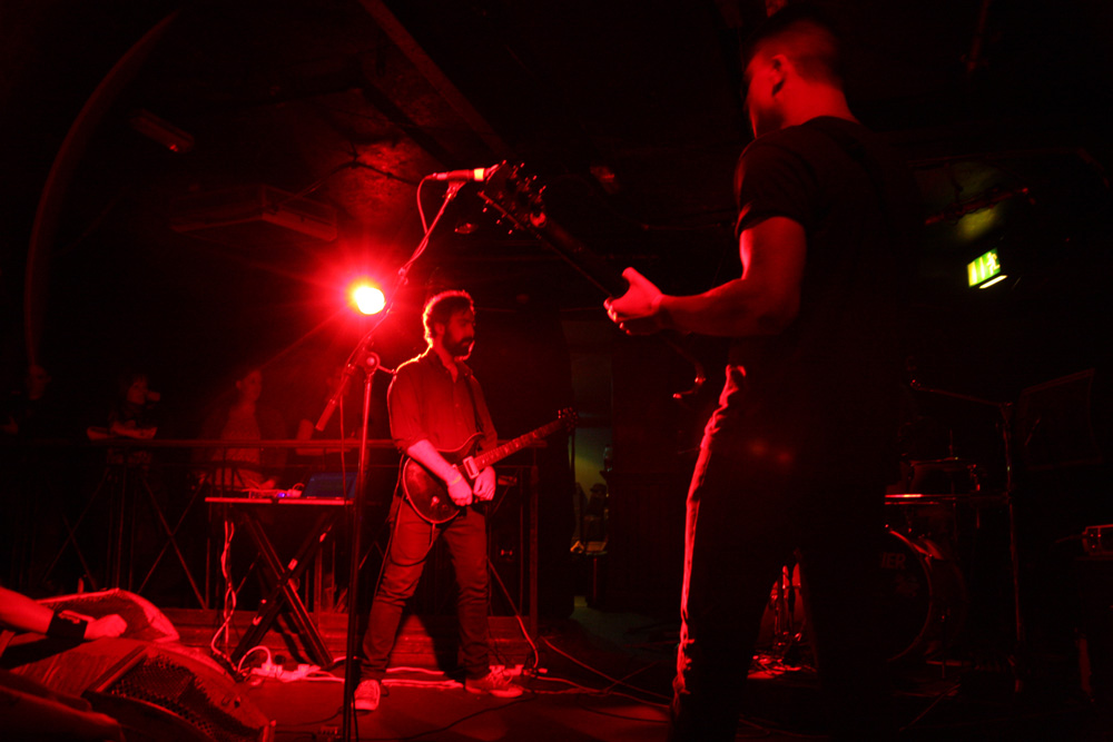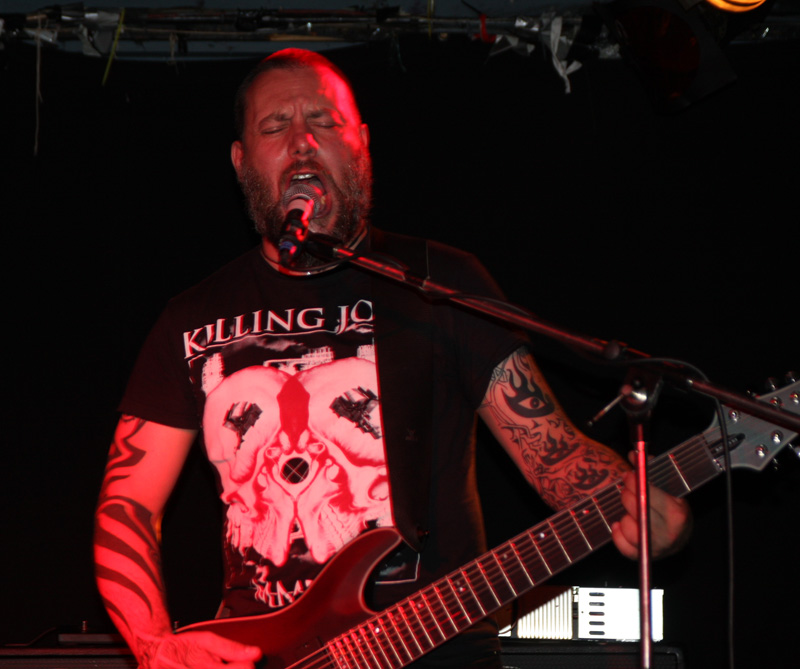 Next up was the section of three bands who I had never caught before. The first of these Crown from France had impressed with recent debut album Psychurgy and I was keen to see how this drum machine enhanced act would translate to the stage. It worked out that once they got going they dropped us into their ‘Abyss’ of sound quite nicely. The two guitarists and bassist lined up the front of the stage and the thick multi-layered sound surged out the speakers as they rigorously attacked their instruments. Slowing down to chilled brooding parts and crashing in with an acerbic post-industrial tumult they certainly kept us on our toes. Unfortunately the caustic mass of the music meant that vocals struggled to get out through the mix and this was something that seemed to crop up later in the day too but luckily it was the power of the riff that compelled and transfixed us. The band pretty much played through the album or that of it which they could fit into their time slot moving from ‘Blood Runs’ to Empress Hierophant’ without pause for anything as unnecessary as stage banter. It was the music that was left to do the talking here and it had us straddling an icy plateau as the monolithic slabs of noise had everyone caught up swaying to their multi-hued textures. At times they reminded of Jesu as fragments glistened at others the more fist-pumping surge of Godflesh. Last number from early EP ‘The One’ was called Mare and between it and the weather outside it was a wonder that the building was left standing. The sound of silence descended but with the buzzing left in my ears I wondered if anything would truly ever be silent again.