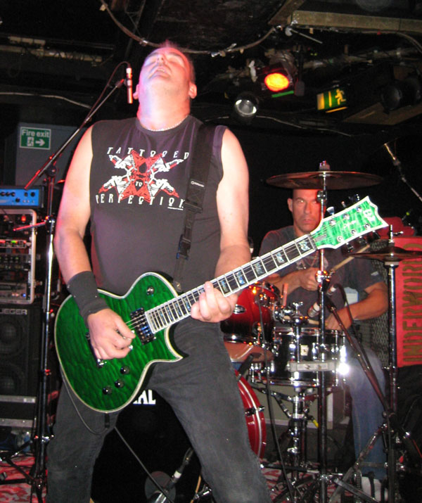 Opening band Tainted Nation only just made it, vocalist Pete Newdeck (drummer of Eden’s Curse) had traffic issues, but a shortened and breezier set made the relatively sparse crowd enjoy the bands clear commitment. Although I did not know this band, some of the members like guitarist Ian Nash (and the aforementioned Pete Newdeck) have recorded with the Steve Grimmett band on their 2007 album ‘Personal Crisis’. Tainted Nation’s music is what I can best describe as good time British hard rock with strong commanding vocals. The overall sound was a little bass heavy but that did not really matter too much when their current single ‘Loser’ was belted out. This is a band I will certainly check out and fair do’s for them giving cool showmanship on the crowded stage as they had to set up their drums in front of the headliners kit, but still had the ability to work the crowd during their limited time slot.