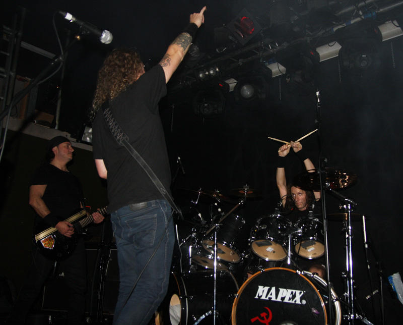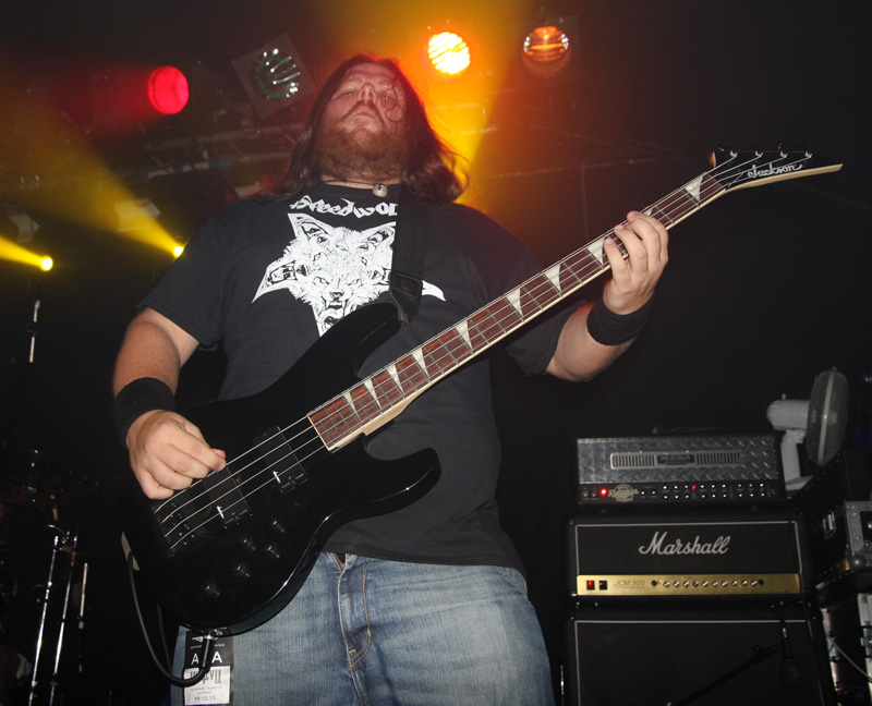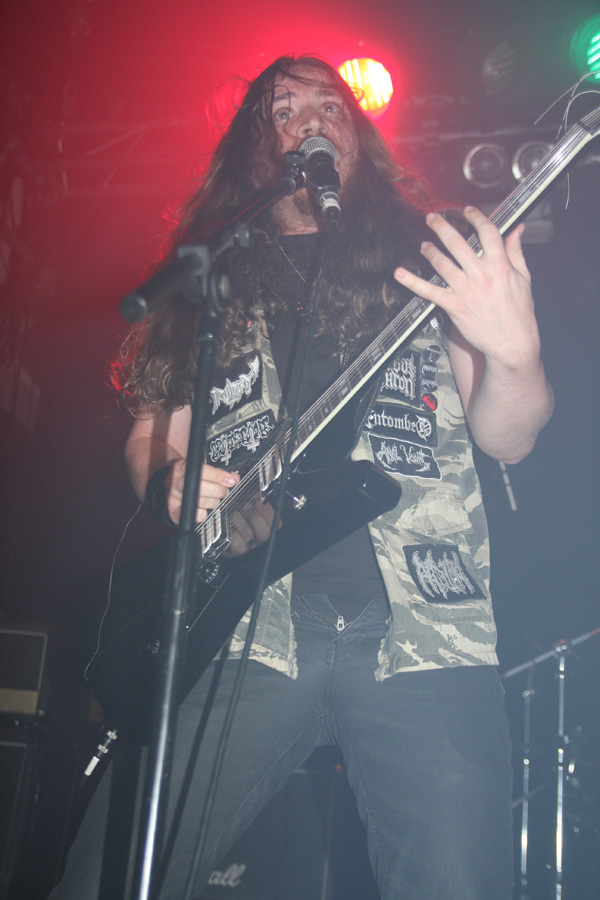 Time for some action from a band from outside the UK and mine and no doubt most others first encounter with Necrowretch from France. This lot have quite a bit of material out there and battered into things with ‘Sadistic Expiation which had a nice and suitably vicious and hollow cavernous sound. This was more like it, extreme and uncompromising stuff with the band playing in really low lighting and foggy dry ice that was great atmospherically if not for attempting to take any decent pictures. The vocals barked and guitars seethed virulently to this morbid death worship as the band ripped into songs from their Century Media debut album ‘Putrid Death Sorcery’ They were not pissing about either, songs were short, sharp and sinister with an eldritch demonic feel about them. Heads cracked in time to the drums and it seemed the audience were getting into things. There were the odd Slayer sounding riffs cutting through the mire and giving things a recognisable slant and the band were receiving rousing cheers between songs so were obviously doing something right. It did seem a bit odd to witness a band this feral and raw playing to so many at such a time of the day but I guess it went hand in liver with the beer we were all knocking back and the short 30 minute exercise of evisceration was just the right length and as it culminated with ‘Zombie Ritual’ it’s necromantic charms had certainly paid off.