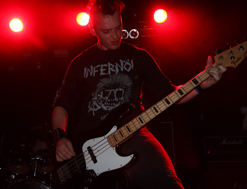 Today this falls to the rather scary sounding Satanic Dystopia from Manchester who were offering us a Double Denim Shotgun Massacre. No guns but bullets were held aloft as they charged on stage. The singer is an imposing figure but I knew what to expect having caught Al Osta live with his other band Ravens Creed in the past. True to form and despite not a huge amount of people here yet I still managed to end up with a beer over my head in the first song as I was in the photo pit. Hell they are almost £5 a pint have people got more money than sense. The sound is pummelling and harsh and the band unleash their ‘Nuclear Nightmare’ thrashing away and melting down with a crusty backbone about it. I would not agree with any real black metal tag here but certainly liked what I heard. Not much in the way of finesse and at times I was reminded a bit of the rotten sound of GG Allin but thankfully without the shitty stench and smell going with it. A few samples worked well within the music and the venue started to get busier ‘Tombstone Queen’ was a sludgy foul morass before spreading legs and romping off. All in all a good slab of demo sounding thugcore, the Bastard Squad did good!