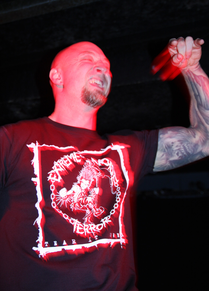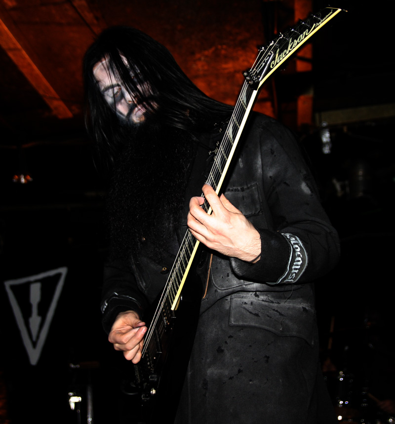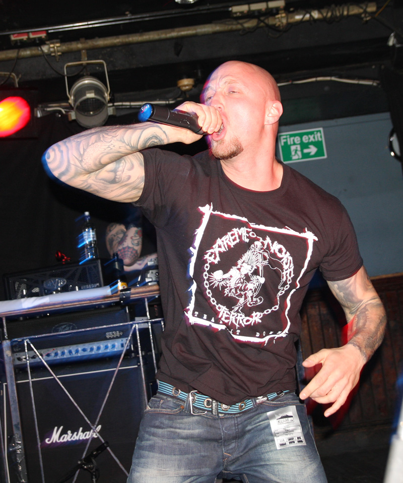 Onto the self-proclaimed punk filling in the black metal sandwich and it’s up to The Rotted to show they are no corpse-painted badger metal band’s bitches and even if they lose a few grimmer than thou members of the audience there are plenty to take their places as everything quickly kicks off as they blast into ‘Surrounded By Skulls.’ Having only played a handful of shows (5) this year it felt like they were really letting off steam after having been somewhat pent up especially as they have not played their home town in some time. Singer Ben is certainly in a chirpy mood leading the anarchogram terrorists into a spot of quick fire comedy between songs and mentioning the bands previous origins and saluting the hugely missed London scene that revolved around the Devil’s Church all those years ago. Still they find time to crack heads and bruise us with songs like The Howling and Non Serviam from 2011 album (can we have a new one please) Ad Nauseum. These are as violent as one would expect and the singer charges around the stage making me want to see him in a stand off between Dick Lucas and Barney Greenway to see who is the fastest (Ben probably has age on his side here). He’s kind of like a bull being shot repeatedly with tranquillisers and enjoying it! If he doesn’t slow down though he’s going to forget what songs next, oops! New single Rotted Fucking Earth is a stormer and the band marry Discharge and Motorhead together with crusty finesse, standing back there’s even a bit of the old Sex Pistols sound in there. We get a brand new song which I wasn’t expecting at all called No One Is Innocent. Apparently they played it last night at Eindhoven Metal Meet after following on from In Solitude who apparently left the stage with the singer in tears! Well nothing emo about this at all and it’s a storming, sledgehammer, battering ram of a number, which really gives drummer Nate a chance to have a right old work out. Apathy In The UK has great grind style vocals and full on chugging beats and things bomb along until Nothin’ But A Nosebleed finishes off a blistering and dizzying set. The Rotted knobs did good. Can I fall over now please?