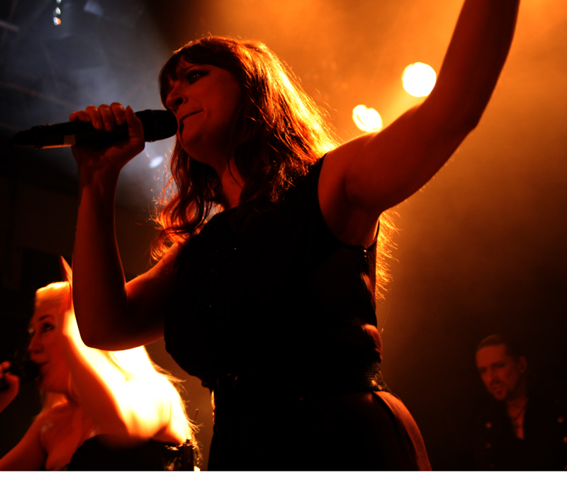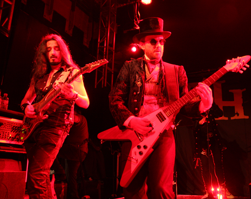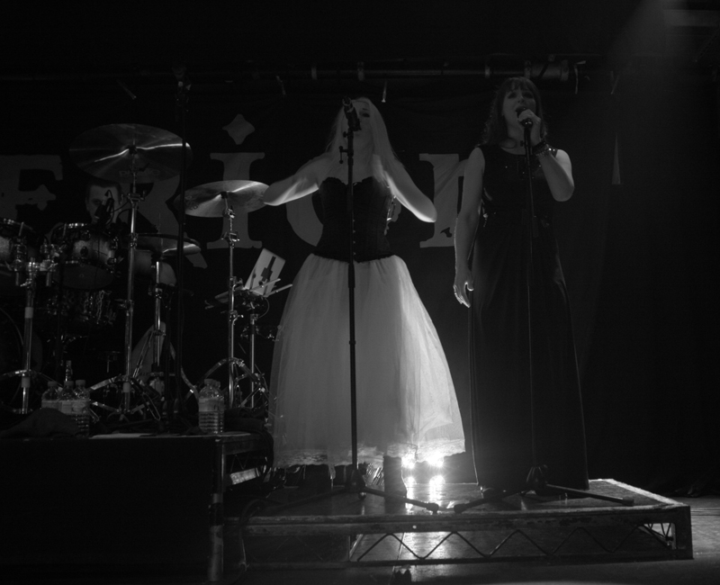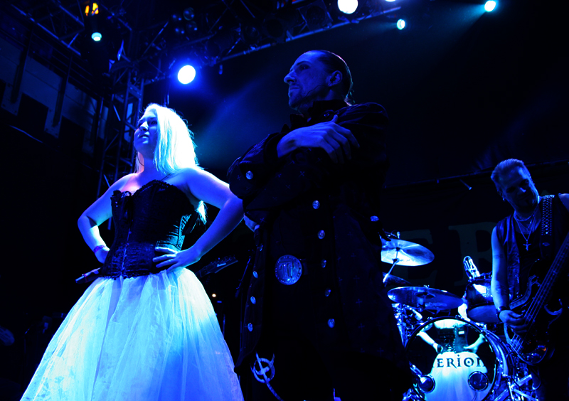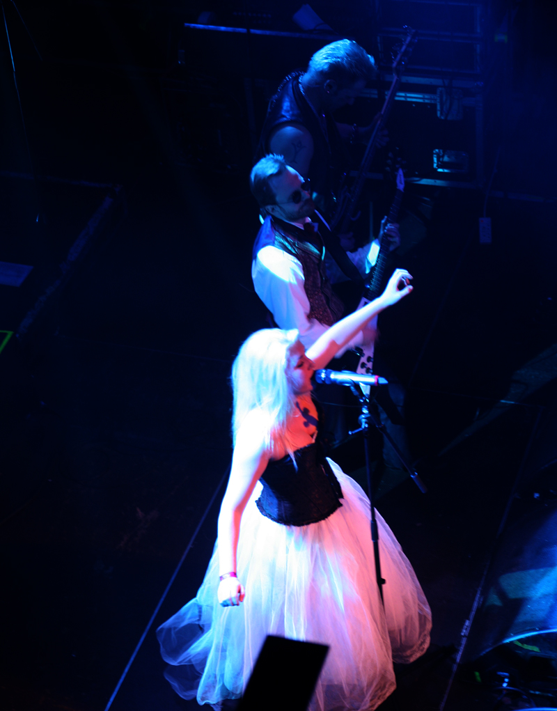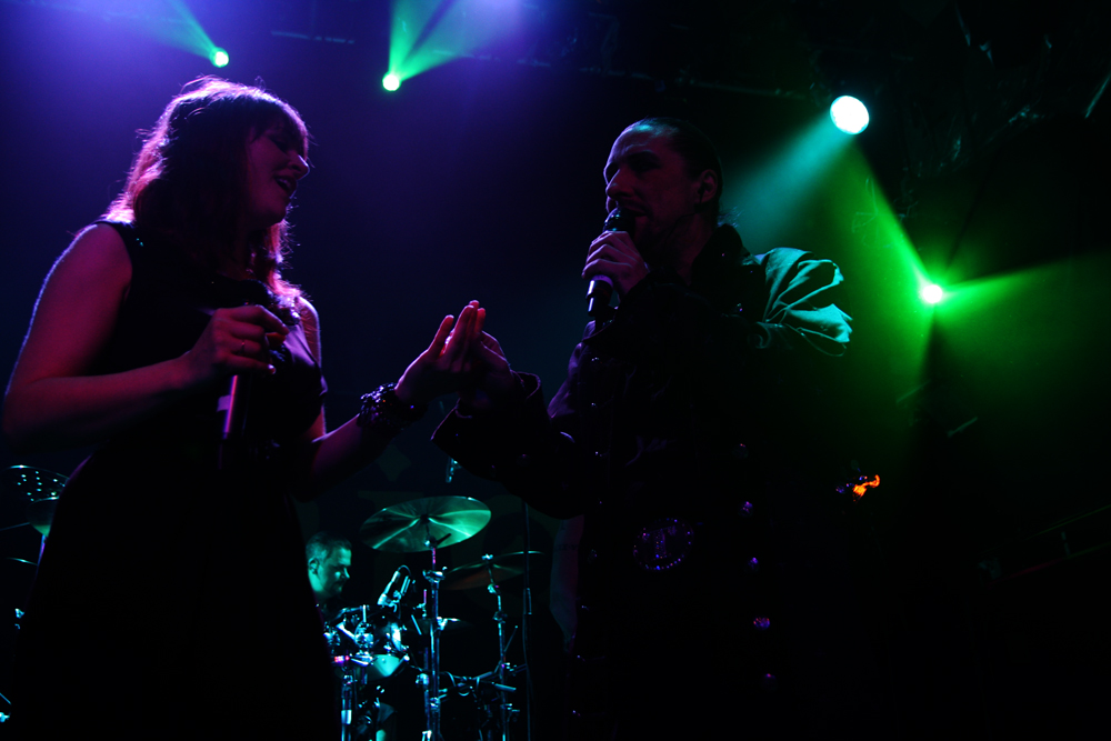 Therion certainly had the place near packed and many sounded like they were gathered from all over Europe judging by accents and languages overheard. The stage was used to full capacity as they trooped out and the instant the stirring strings of ‘The Rise Of Sodom And Gomorrah’ reached us we knew that this was going to be both a spectacle and spectacular and were certainly not proven wrong. Part of the mystery was taken away as we knew what was going to occur for most of the set as the band were taking us back to 1998 and playing the entire ‘Vovin’ album from start to finish for us. The album playback gig seems to be something that has become more popular over the last few years and I tend to try and avoid these sorts of shows but tonight it really worked, perhaps as Vovin is such a brilliant album and maybe personally, as until digging it out prior to the show, I had not played it for a while. It was difficult working out what to fixate on the stage as the players leading us through the drama were constantly changing position. A top hatted Christofer Johnsson rocked out on guitar not taking centre attention at all and in fact nobody really was I realised as things progressed. Thomas Vikström was providing quite a lot of the male vocals sticking towards the back of the stage a fair bit and the gorgeous siren operatics of Linnea Vikström and Lori Lewis saw them centre of stage at times and also towards the back at others caught in illuminating white spot light. Over on our right was the constant presence of Nalle Påhlsson who hit the fiery guitar parts and really rocked away. The operatic chant of ‘Wine For Aluqah’ proved pretty intoxicating and dramatic and this was as metallic a pantomime as anyone could wish for, pretty much a perfect show to end a year off on. Naturally there are favourites and one of mine was coming up ‘The Wild Hunt’ which sees ‘Vovin’ at its most shredding and with the fiery guitar parts and Maidenesque lead vocals it pretty much brought the roof down (perhaps a poor turn of phrase considering recent theatrical events but). I was actually right by the roof later as I went to watch the show from above for a while and can contest with another cliché that Linnea’s voice in particularly did a fine job of hitting the rafters.