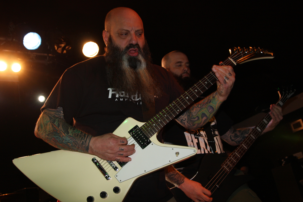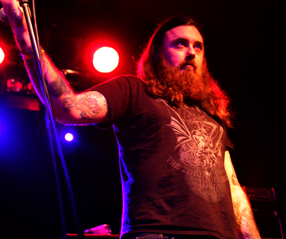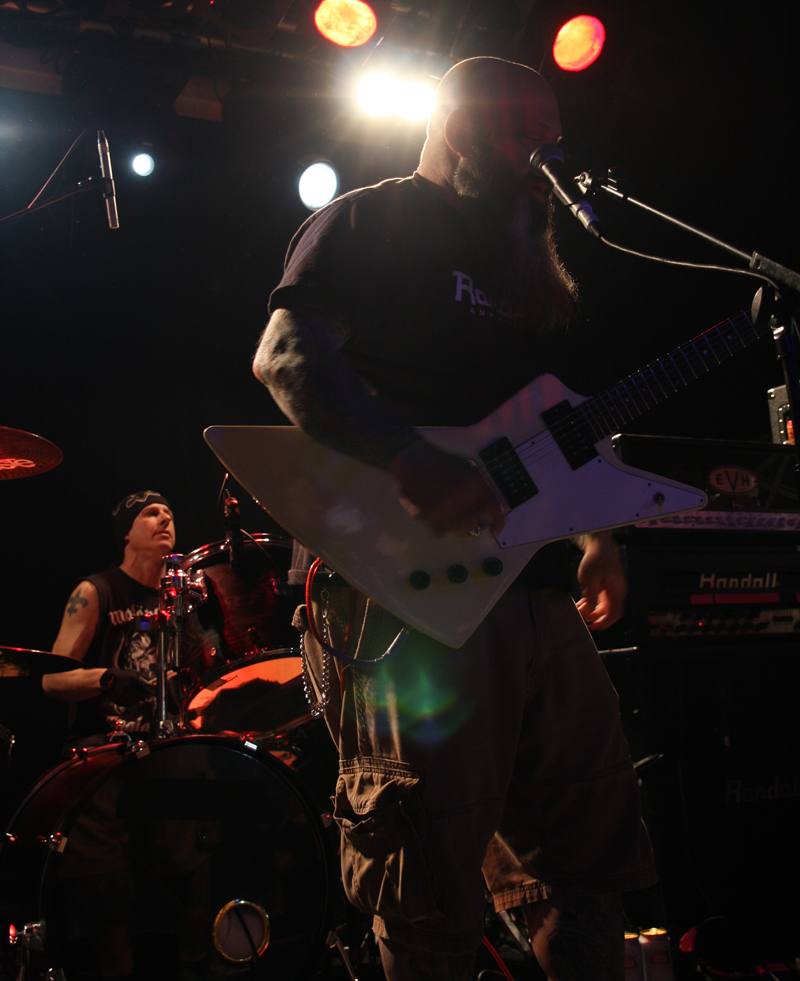 I lose track with Hang The Bastard and what’s going on with them and band members. They occasionally pop up and play and sometimes releases find their way through to us. I think it was at Damnation festival 2012 that I last saw them but this was a completely different affair without a shred of the ‘core’ sound I remember them playing. Instead we had a different singer Michael Carver and a much looser stonerfried sort of sound going down. This naturally made them the perfect choice of support for the headliners and they effortlessly jammed away with swamp heavy licks which sounded as though they had snaked straight out the bayou. It was still very heavy and there was even a touch of the blues about it all which had people both swaying along and head banging. Vocals were shriller than expected almost yapping but they fitted in quite naturally. I realised that the atmosphere was dry (that’s my excuse and I’m sticking to it) and that a beer was very much needed to help the music go down better. The bar area was still utterly rammed but mission eventually successful it was back towards the front feeling like I had just got the final pint at the last chance saloon. At least the band were up close and personal here, the main drum kit was not being used and the sticks man was playing tucked up stage left on a smaller kit. It seemed that this half hour shot by and the songs were long and perhaps they only actually got through a few in the time they had.