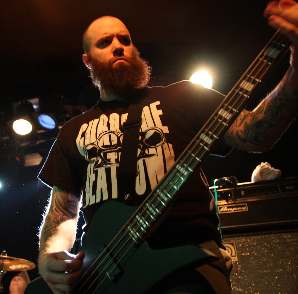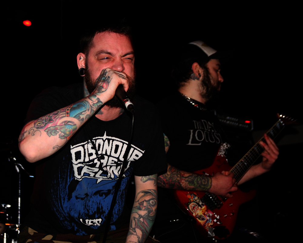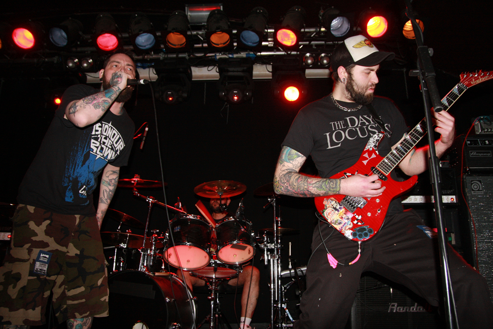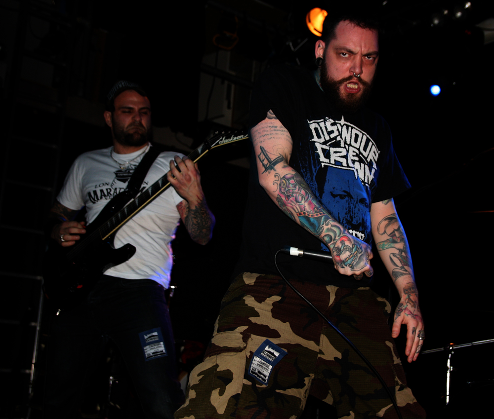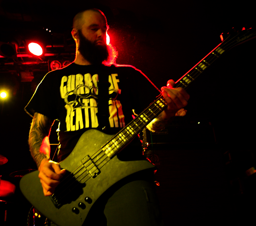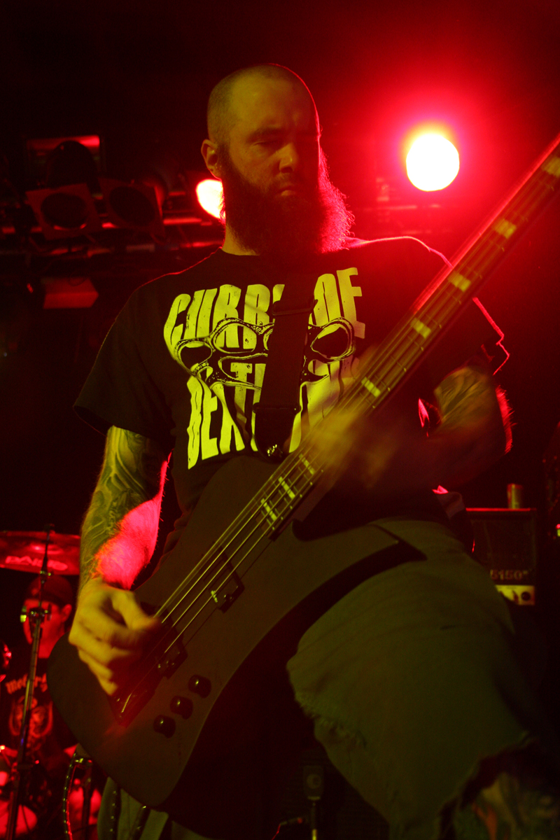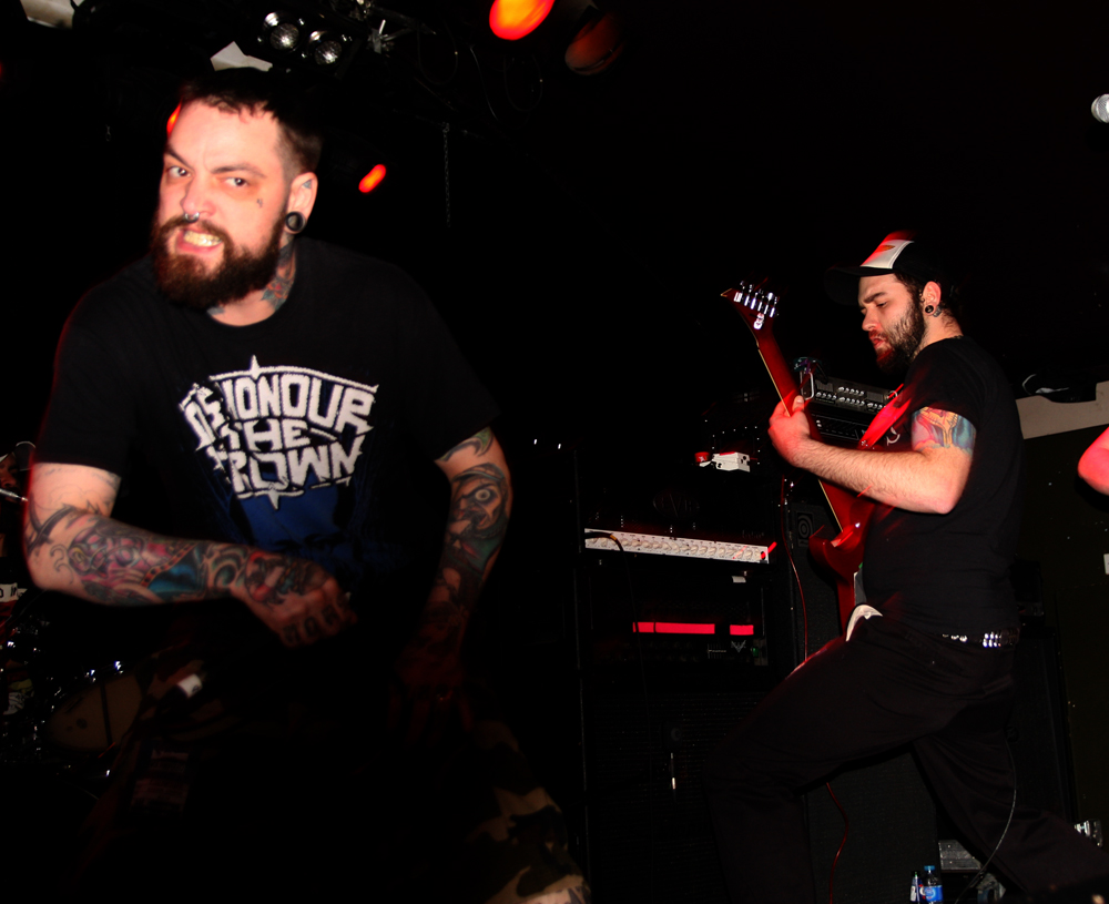 Oof this is one heavyweight bill that’s been winding its way from Manchester to Glasgow taking in ten unsuspecting UK towns. Half way through and it’s London’s turn which is perfect for the opening band Dripback as it sees the mockney bruisers playing to a home crowd. They are not quite at full complement though as Adam da Rat is apparently on other duties down under so instead Pete Benjamin of Voices is handling bass tonight. Musically this does not hamper them at all and as the first powerful and totally abrasive number blasts out the speakers we are practically flattened at the front. It takes a little while to get acclimatised to the hefty wallop from it all and to be fair the band have not been particularly kind to any PA I have heard them spew out of in the past. With a shout out of “come on you cunts” we proceed to get ‘Wasted’ in style and the music crushes like a steam roller as Wez 4 runs around the stage hollering at us. It’s pretty in your face stuff but new album ‘Failed Futures’ has done the band no end of good turning them from a mere racket to a racket with actual songs. There’s much more definition about these vicious onslaughts although the pit is just for the brave with more sensitive punters clinging to the bar at the back for dear life trying to distance themselves from this utter British cuntery. ‘Shallow Lives’ makes a particularly good impression as they continue to beat the venue down into submission and even when they slow down the force is just as crippling. Time to keep mouths shut and heads down for ‘Profit Driven War’, it’s a remorseless half hour and gets some in the pit acting as though they have just walked into a Ruktion show. By the time they finish with ‘Stranglehold’ they have certainly made their mark, luckily all four walls are just about still standing so we can catch the rest of the bands.