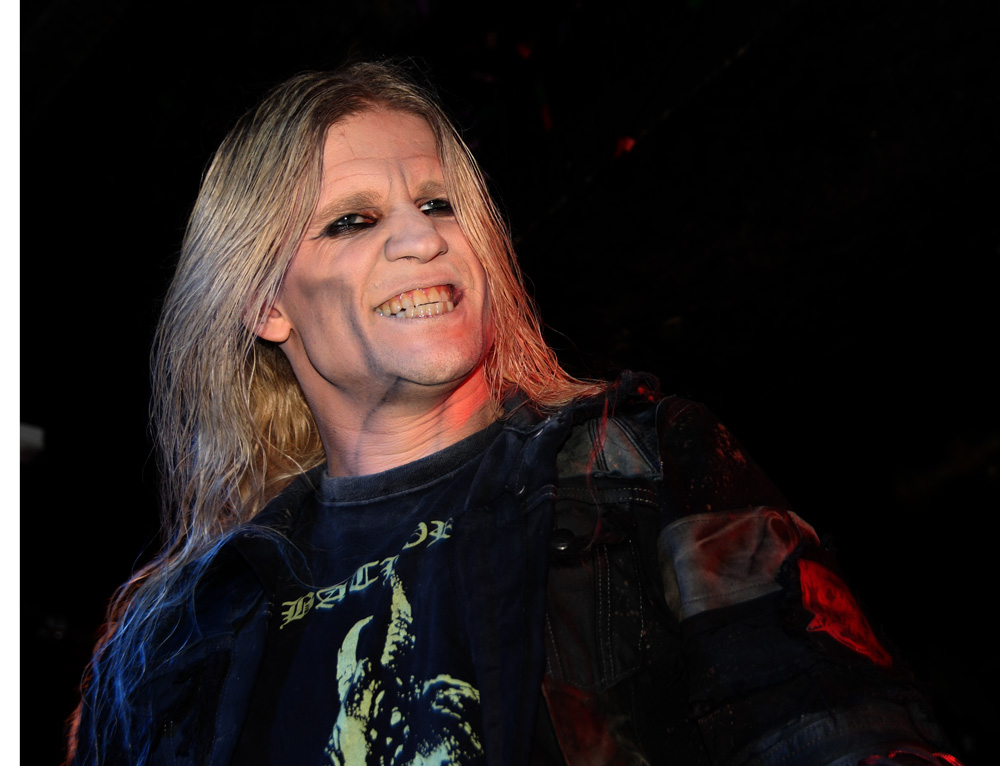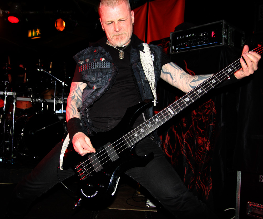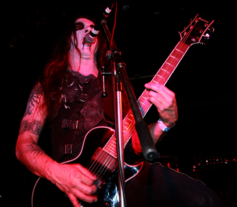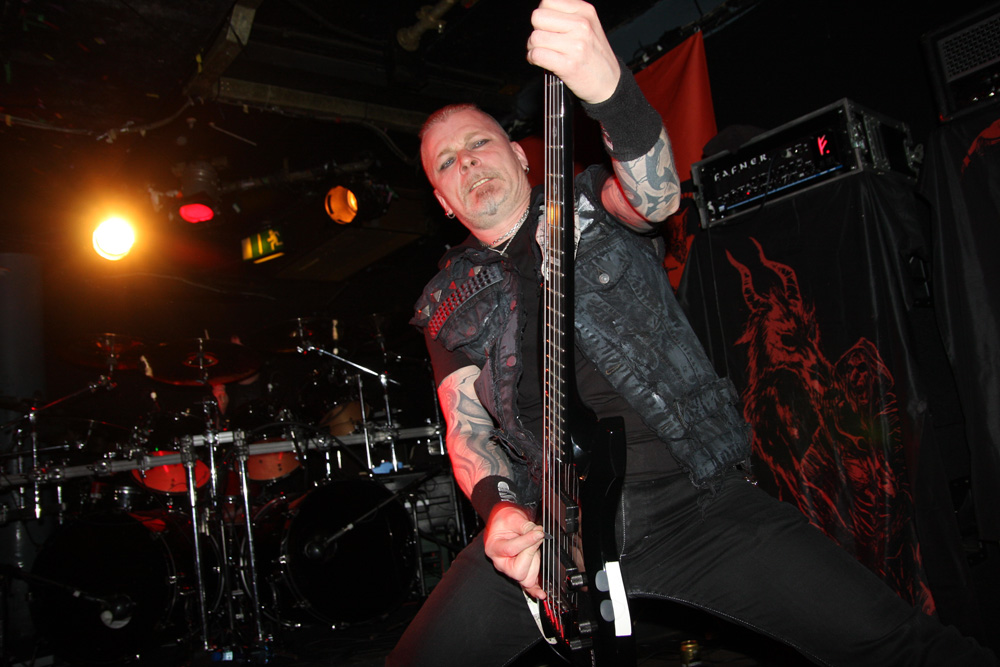 With excellent new album ‘Djevelmakt’ still fresh in our ears it was only right that as Kampfar strode onto the stage that the austere piano parts of lead number ‘Mylde’ were billowing out the speakers. As the band barrelled into the song itself it instantly sounded thick and meaty and as impressive as it does on the album itself. Dolk harangues us vocally as the band drive the pace along and it was met by a fist pumping fervour from those tightly packed in at the front. Although at first concentrating on the new album we were not complaining as the weight of ‘De Dødes Fane’ literally slammed into us with a fury heavy enough to take breath away. Bass player Jon Bakker seemed really into it grimacing and bowing his head concentrating on building up the wall of sound and Dolk seemed in really high spirits no doubt spurred on by the reaction these new numbers were getting. Time to take us right back though and we knew it as soon as the didgeridoo call of ‘Troll’ blew out across the venue. It was a case of digging into position and letting the fervour of the number ride roughshod over us. The jubilant neck bracing song went down perfectly, the fast parts literally tearing away with the players all passionately throwing themselves into things. There were plenty of horns being held aloft in response and appreciation too.