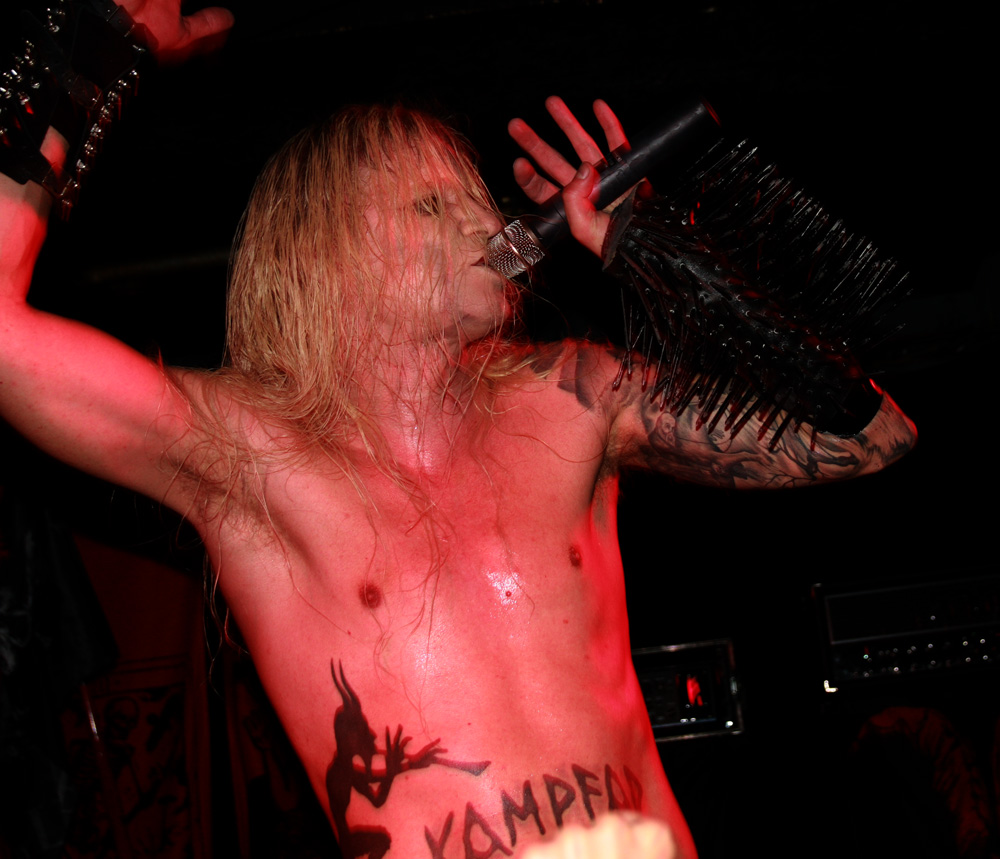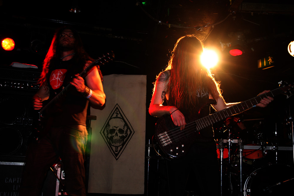 ‘Swarm Norvegicus’ is as potent as hinted at on disc with those sinister piano parts heralding us into the underworld and a slow gravid build that sees the singer literally roaring like a lion. Moving into Kvass the springy, jaunty bounce of ‘Lyktemenn’ is completely infectious turning the place into a seething party mode as the spiked gauntlet of the singer threatened to impale those headbanging away down the front. Every band has their opus that they simply cannot get away without playing live and Kampfar are no exception eventually dishing out the mighty Ravenheart with aplomb and appeasing everyone keenly waiting for it. Apparently the singer had told us before playing it that he really enjoys London and every time he comes here he ends up drunk. I think most of us were at that stage by now too. Pulling some real olden ‘Hymne’(s) out the bag to complete the show sees the twanging Norse cleave of first album material upon us. Bridging that with another excellent new one the years are suitably separated between ‘Our Hounds Our Legion’ and the ultimate battle chant of ‘Norse.’ Kampfar yet again did a formidable job, they came, saw, got drunk and conquered. It’s criminal that they have not been on the bill of a certain British festival yet but hopefully that time will come. A great night all round.