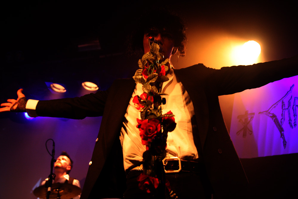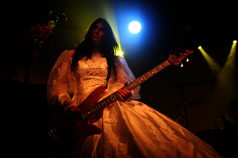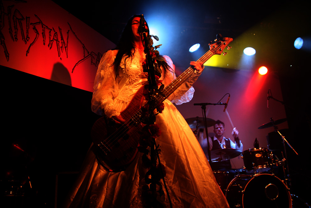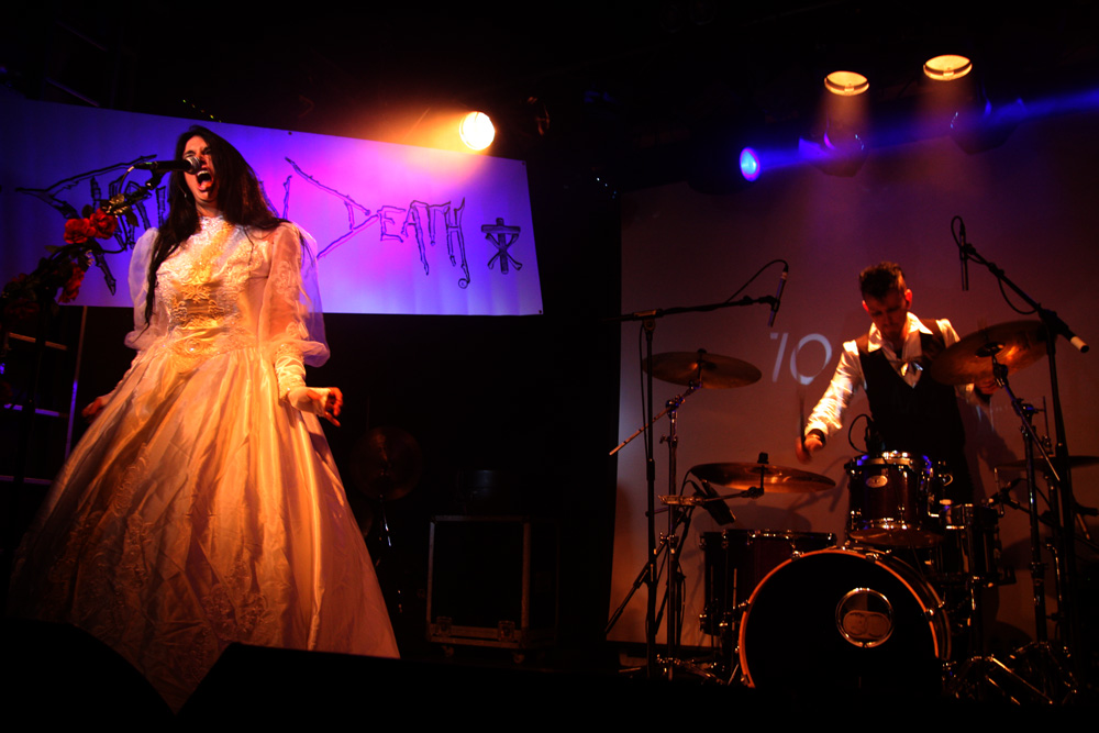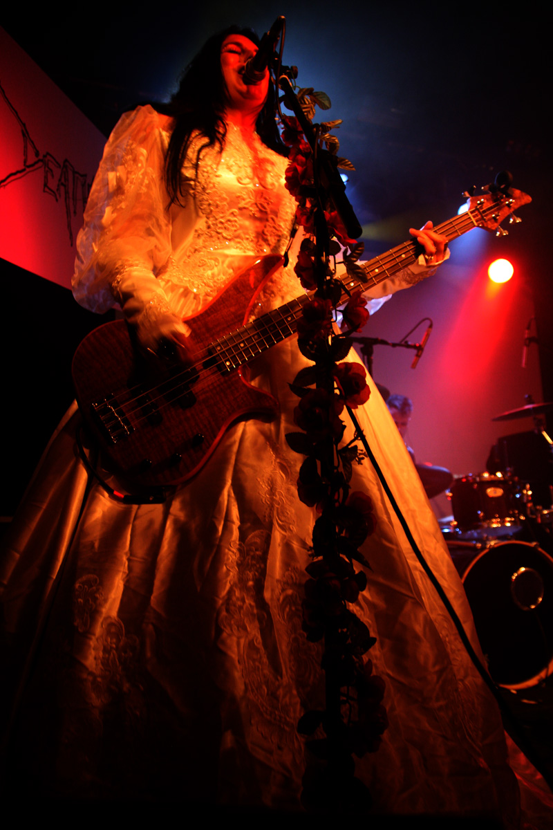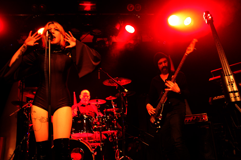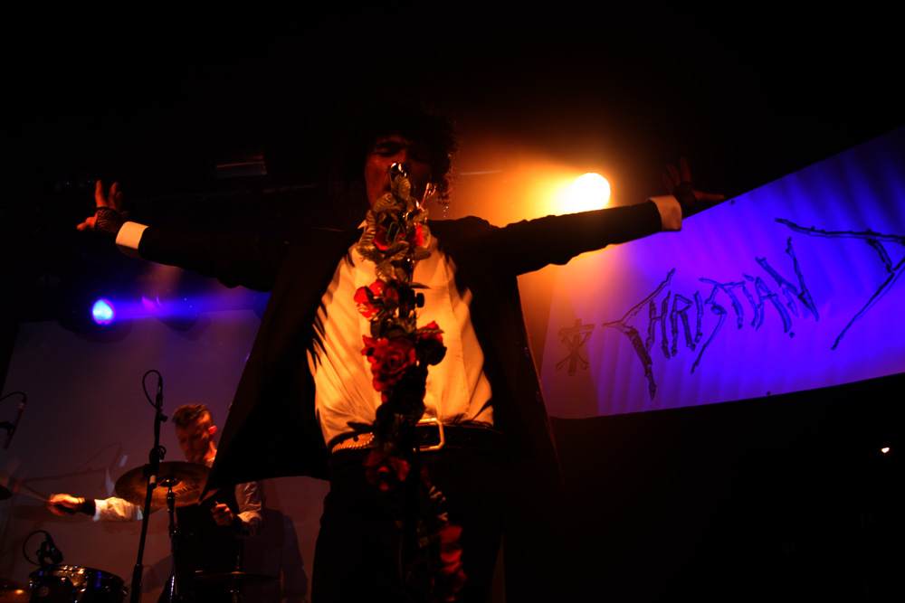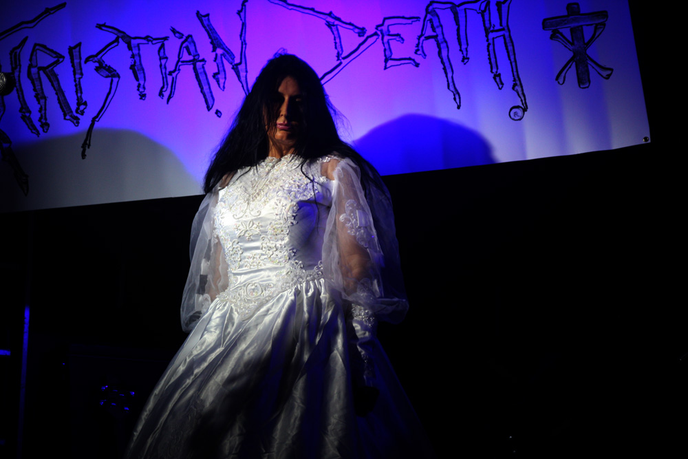 I would say expectations were running high for the first date of this Christian Death 30th anniversary of Catastrophe Ballet tour but the half empty venue kind of suggests otherwise. Historically original singer Rozz Williams hung himself back in 1988 and it is left for Valor who wrote most of the music on the album as well as performing on it to bring it back to life along with long-time collaborator Maitri and drummer Jason. It has always been a contentious issue among long-time fans of the band about rights to the name and no doubt a few were ruffled by the fact that this album was even going to be revisited live. I am not one of them and was looking forward to this. It’s a suitably near apocalyptic build before the precise drumming hones in The trio on stage are certainly a spectacle with Maitri in a bridal gown with full trail and the gents dressed up suitably dapper. Things really hone in particularly with ‘Sleepwalk’ and the drums thunder as that classic death rock groove is furrowed away, Maitri’s strident yells add to it and it’s a meaty bounce around point of proceedings. Valor tells us how much he loves London and the band go off for a costume change coming back less encumbered and to wrap us in further numbers from this sinuous and sultry album. It sounded pretty full on at times, more than I would have expected as it’s quite a dreamy, sleepy album in essence and they did a good job with the material as a trio. The audience what there was of it was definitely on the subdued side though. Valor came out of his shell more and it became somewhat obvious that he had been partaking in a few backstage beverages as he informed us the video projector was not working and we should take some drugs and imagine what it would have looked like. Taking another break one got the feeling that things were not going 100% to plan.