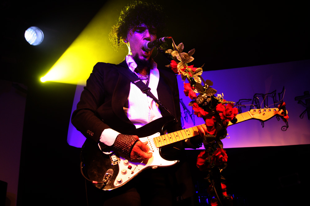 It was time to dose up for Manflu who having just found their homepage describe themselves as Russian Prostitute Rock! Ok, well focus was on a female singer dressed up in slutty Daryl Hannah Blade Runner mode and a bunch of eccentric looking cohorts. It was all a bit avant-cabaret with quirky thick bass, an eclectic vocal stance and plenty of on stage grooving. It was different, I’ll give them that! Vocally I guess everyone is going to hear something different, indeed discussing it with someone proved this. For me there were bits of Bjork, Hazel O Connor and Lena Lovitch all mashed up here along with some evident Gaga mentalism. Songs were kind of lost up their own collective arses in the process and I got a distinct impression that they were simply trying to be too clever for their own good. Prone to bouts of deranged wailing and skronky rhythmic thrusts I guess they were an acquired taste. There was no faulting the performance but it was like being laid up with the flu itself and a box of multi-coloured tissues pulling them out one at a time and never knowing quite what colour you were going to get next. A long guitar and drum passage was particularly obtuse and unnecessary and I had by this point had more than enough. Put them on at some trendy Shoreditch watering hole supporting Mr Bungle and the crowd will no doubt lap them up but for me, miss!
