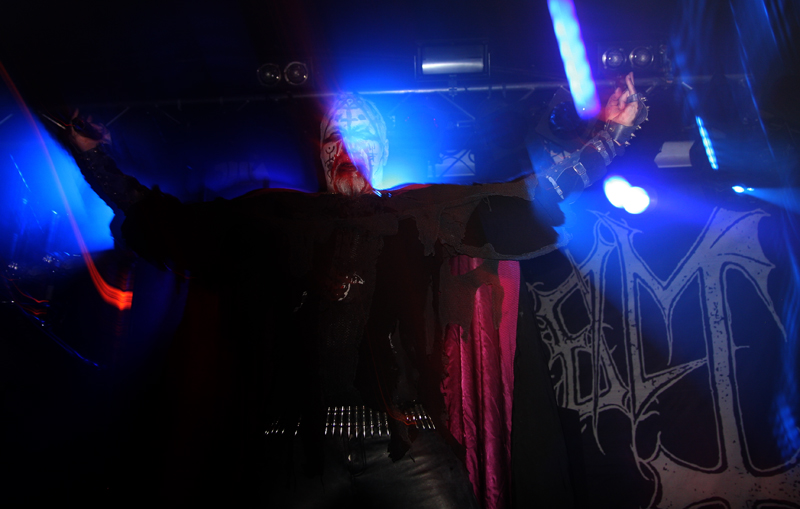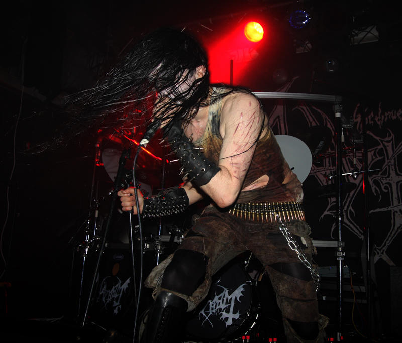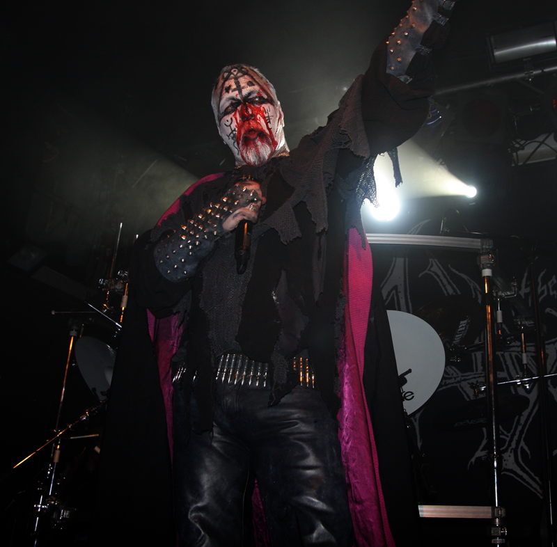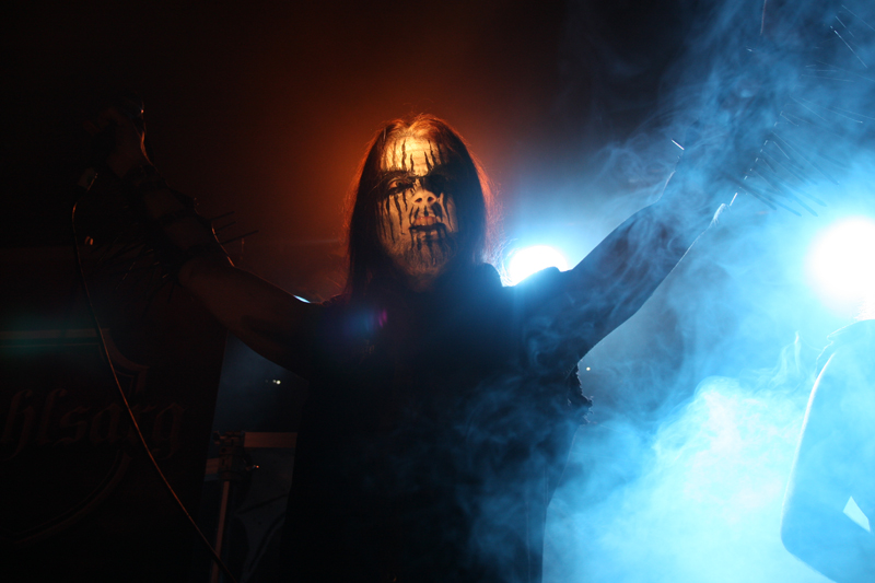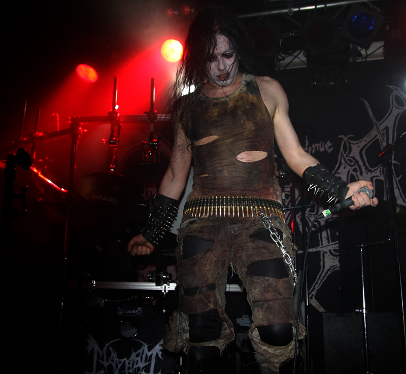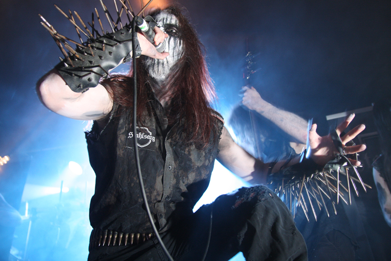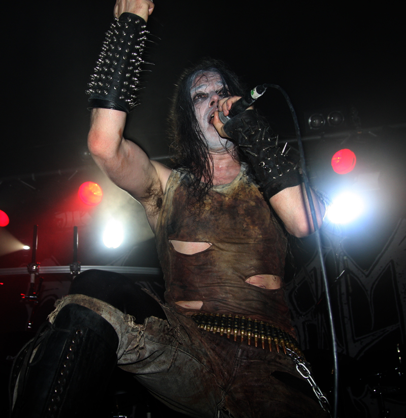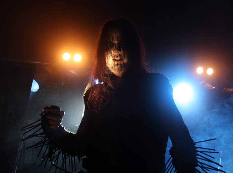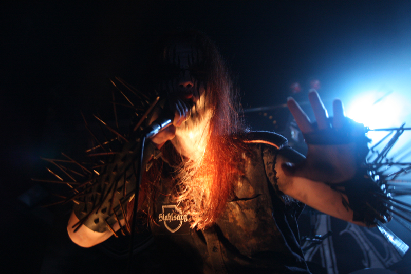 It did not look like that though as Stahlsarg set up to play their debut English show, not bad for a bunch of Brits supporting the mighty Mayhem on their first UK outing! Not that they are all completely new to the scene though and they have certainly not come out of nowhere. As anyone in the know realises, this troop of inglorious bastards forged new allegiances after escaping the Eastern Front and there’s quite a bit of expectation on how they would match up to former glories after changing sides. Luckily it’s quickly evident that their first assault here is going to be a formidable one. Aesthetically it is all suitably grim with dry ice billowing like fog, cold blue lights and stark white spotlights. They very much live up to the name of their first number ‘Frostbitten Division’ and as far as arms are concerned the lethal spikes singer Metzger has clad on his have me backing up a bit not wanting to lose an eye or be impaled on them. Energy and might combine with warlike fervour, heads bounce in time to the music and the sound is thick and punishing. It’s apparent that quite a lot of people made sure to get here in time to see this lot and they have plenty of support, those down the front showing their appreciation and spurring the band on into ‘Black Valhalla.’ It’s slightly difficult getting to grips with brand new songs on a first listen live, but this stormy blitzkrieg is instantly compelling and leaves me hungering for more than the mere half hour the band have. All too quickly we are at last number ‘Damocles XII’ rumbling in with a solid groove and crunching on mid-paced and hellish with some slow doom like guitar riffs before flinging us into full on trench warfare, madness to the very death. The album can’t come quickly enough!