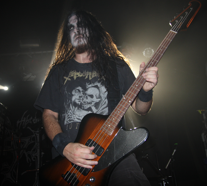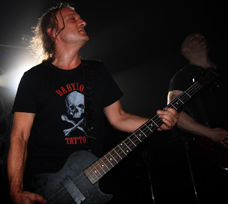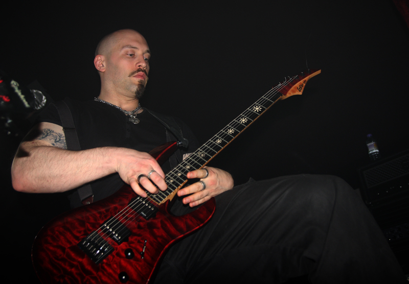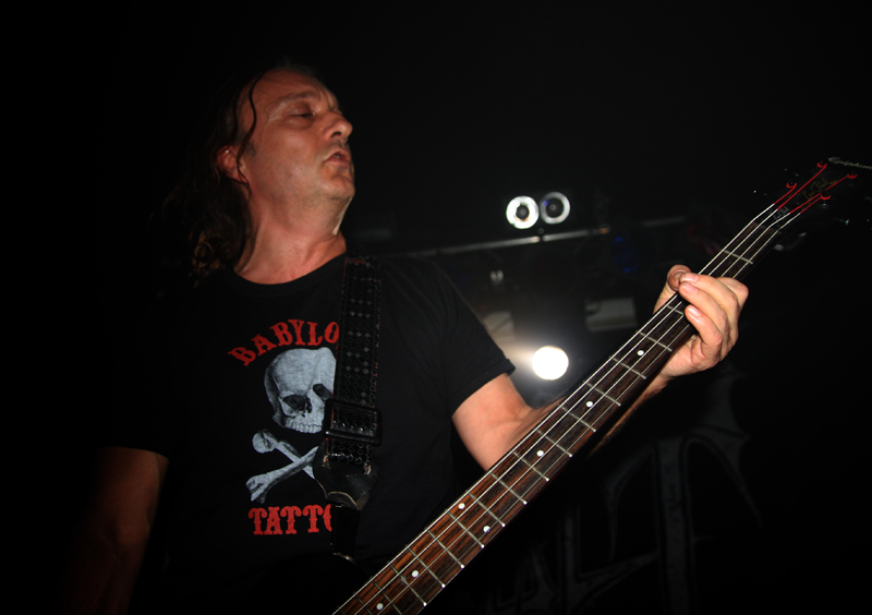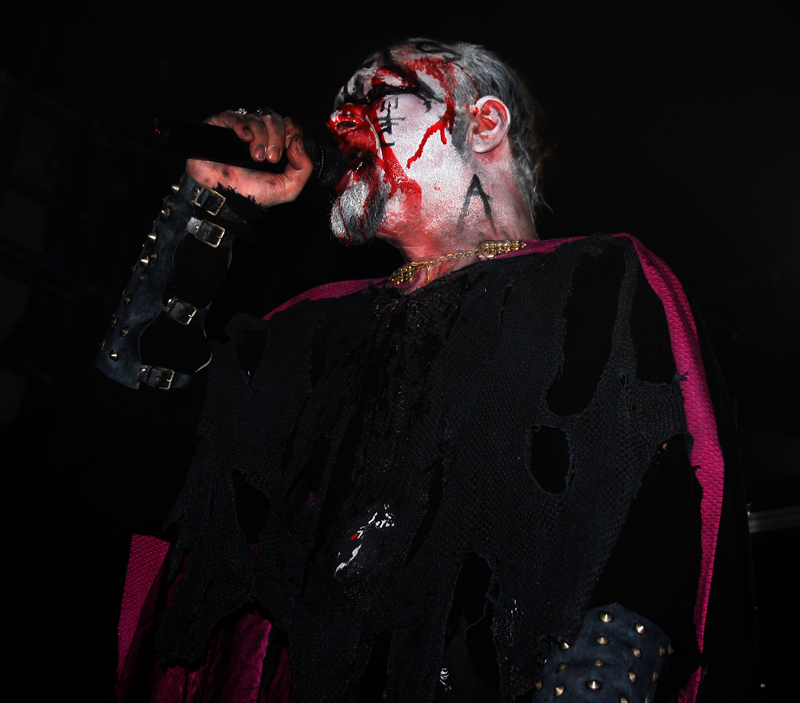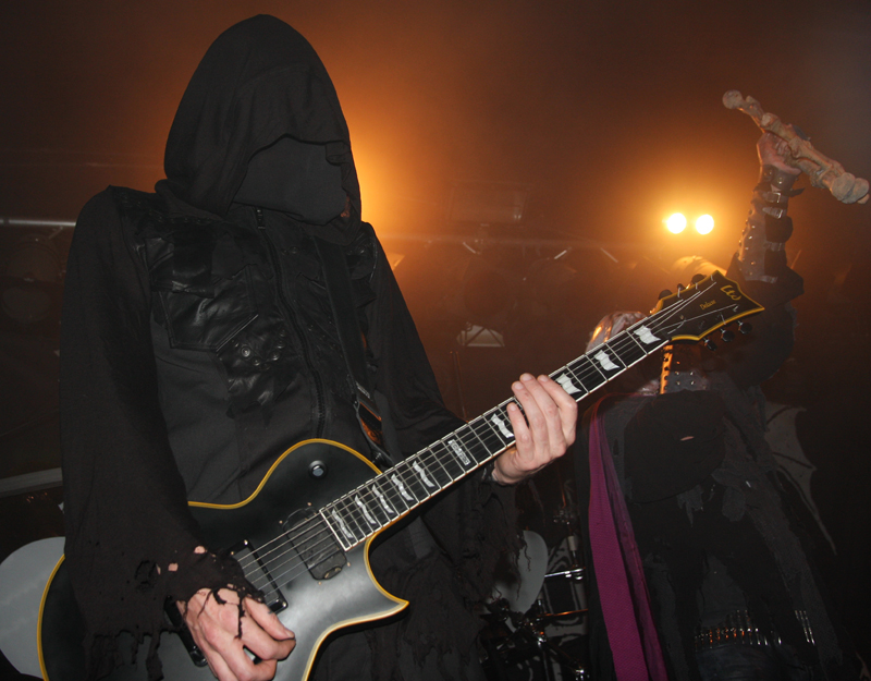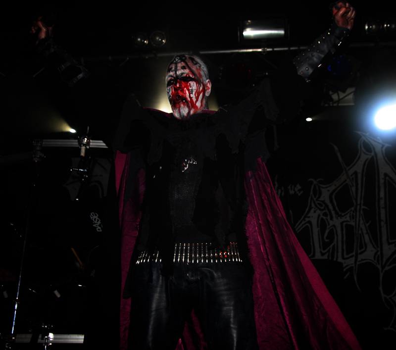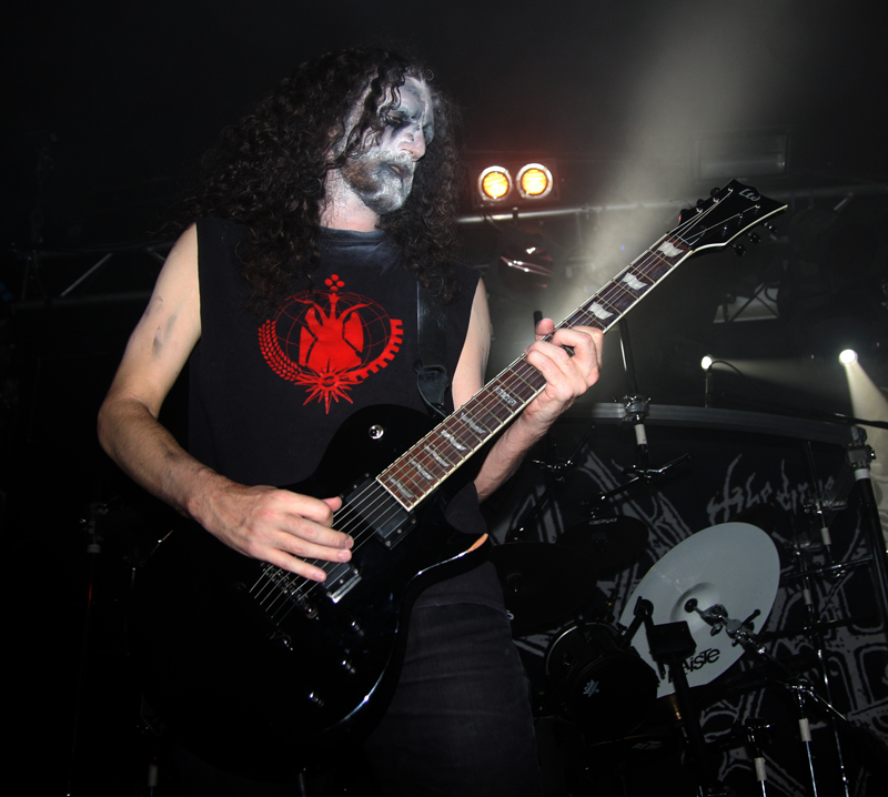 It did not look like that though as Stahlsarg set up to play their debut English show, not bad for a bunch of Brits supporting the mighty Mayhem on their first UK outing! Not that they are all completely new to the scene though and they have certainly not come out of nowhere. As anyone in the know realises, this troop of inglorious bastards forged new allegiances after escaping the Eastern Front and there’s quite a bit of expectation on how they would match up to former glories after changing sides. Luckily it’s quickly evident that their first assault here is going to be a formidable one. Aesthetically it is all suitably grim with dry ice billowing like fog, cold blue lights and stark white spotlights. They very much live up to the name of their first number ‘Frostbitten Division’ and as far as arms are concerned the lethal spikes singer Metzger has clad on his have me backing up a bit not wanting to lose an eye or be impaled on them. Energy and might combine with warlike fervour, heads bounce in time to the music and the sound is thick and punishing. It’s apparent that quite a lot of people made sure to get here in time to see this lot and they have plenty of support, those down the front showing their appreciation and spurring the band on into ‘Black Valhalla.’ It’s slightly difficult getting to grips with brand new songs on a first listen live, but this stormy blitzkrieg is instantly compelling and leaves me hungering for more than the mere half hour the band have. All too quickly we are at last number ‘Damocles XII’ rumbling in with a solid groove and crunching on mid-paced and hellish with some slow doom like guitar riffs before flinging us into full on trench warfare, madness to the very death. The album can’t come quickly enough!