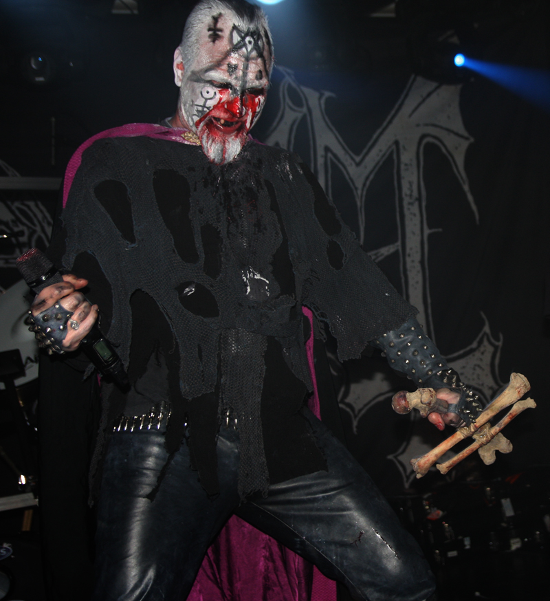 This is advertised as the only UK show for Mayhem in 2014, which is a bit of a bummer really as there are some festivals later this year that would be great to have them added to. Unless you live under a rock you will be well aware of the impending arrival of fifth studio album ‘Esoteric Warfare’ and it’s a belter but the band are not going to be delivering all new material tonight as the set list unveils just the one track from it. One never knows what to expect from the band, let’s be honest some shows in the past have been a complete shambles but thankfully tonight is not one of them, in fact it’s completely the opposite. The drums of Silvester Anfang roll out and everyone is keen to see what frontman Attila Csihar is going to be wearing. As they all take to the stage and go deep into the past we get acclimatised to just what is going on in front of us as Pagan Fears and Deathcrush are resurrected. Atilla is in tattered looking cape, gauntlet studded gloves and macabre face paint and looks completely macabre likes some sort of deconsecrated priest, hell he sounds just like one too croaking and rasping away. Necrobutcher is to his stage right, digging in on bass and on second guitar to his right C Alexander Hedger powerfully firing out riffs. Also on guitar is Teloch stage left, well we assume it is he as his face is hidden beneath a mask and how he sees what he is doing or even breaths is beyond me. Naturally Hellhammer is buried behind his kit, hidden but making up for lack of sight with thundering sound.