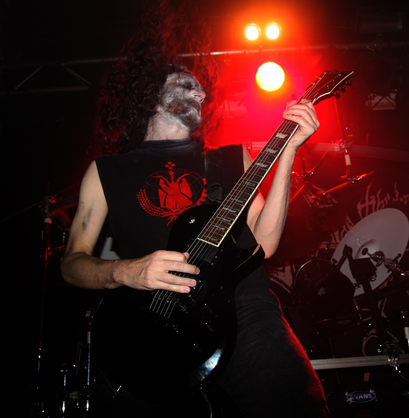 It’s a great result that the headliners are bringing the fine French mob that is Merrimack with them on this tour. I simply cannot remember if I have caught this lot abroad before and can’t remember if they have played on British soil but think not. One thing that does strike pretty much straight away is that frontman Vestal looks somewhat deranged or as I wrote (a complete and utter header) as he charged on to the stage and the band fired up their grim orthodox machinery. I really liked the last couple of albums and fell into the spell of ‘When The Stars Align’ quickly as the sinister angular guitars slithered out and the drums pummelled away without a shred of mercy. Atmospherically cold with the lighting changed to blood red this sucked the life out through a hate-filled vortex and the haranguing incessant vocals snarl and bite away. Getting away from the front with a cold pint I could witness the carnage and the crowd’s reaction to it. They seemed to be enjoying things and some seemed to know the band’s songs. ‘Arousing Wombs In Nine Angles Pleroma’ a mouthful of a title from latest album ‘The Acusal Mass’ sounds grimly foreboding and takes us on a nihilistic descent into the underworld, which is glorious to embrace especially when the song goes into meltdown at full speed. The band have things well practiced at moving mood and pace fluidly from an inferno of blazing heat and speed to doomed filled troughs and then biting back in with feral intensity. Perfect! It was a very welcome and quite a memorable performance and one again that ended too soon for me but with the ‘Gospel Of The Void’ calling it was time to make way for the headliners.
