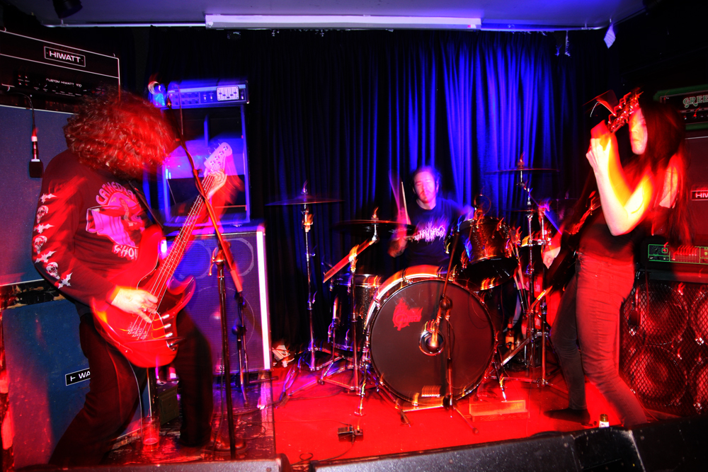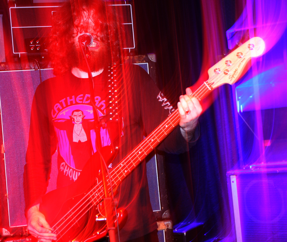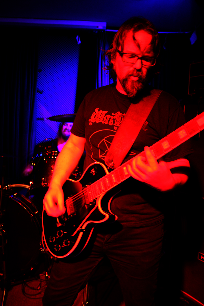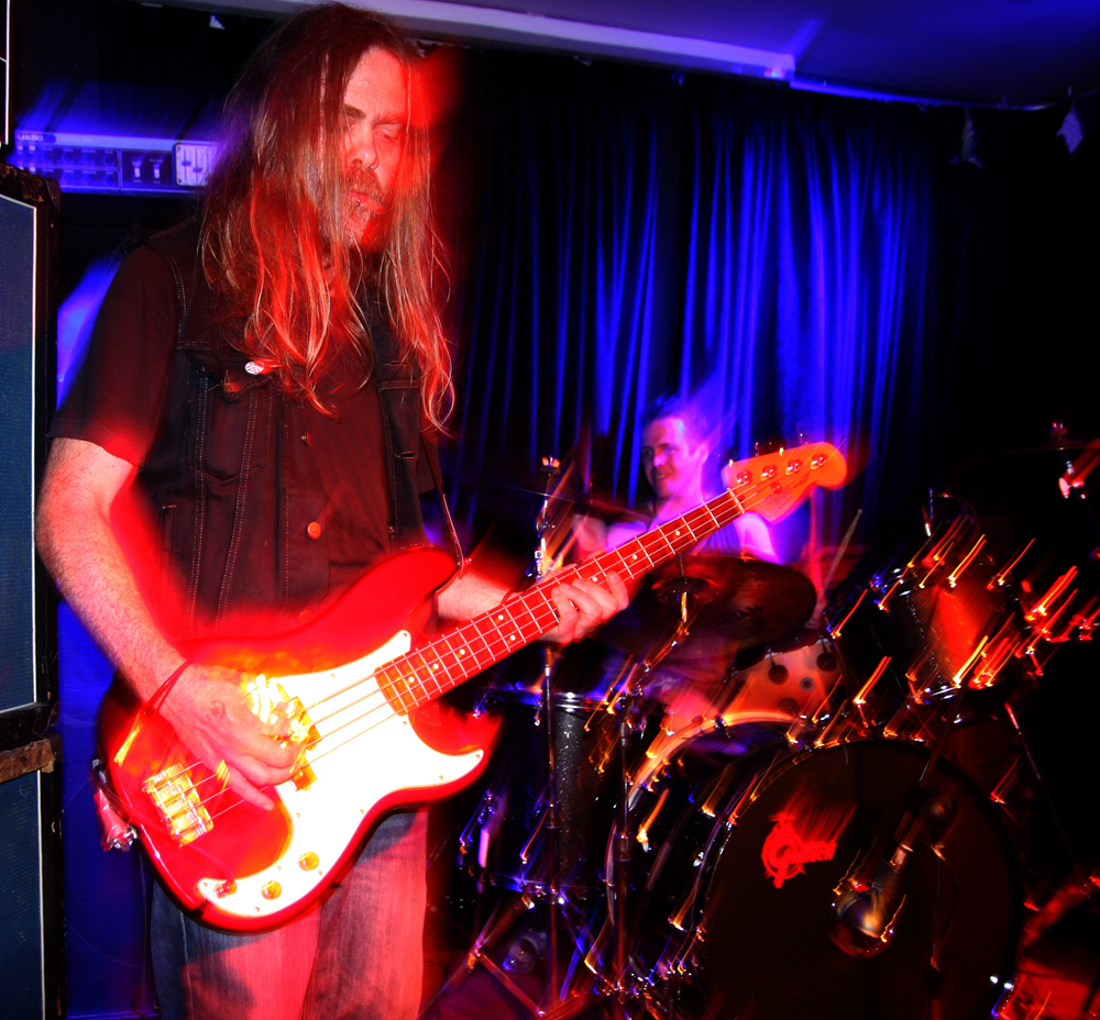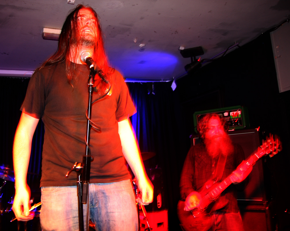 I didn’t give Coltsblood the best of rides last time I reviewed them, it really was a case of wrong gig and wrong venue as far as I was concerned. I had been told they were much better suited to a more intimate place and was more than happy to give them another try. What a difference. The heaviness was immediate and so was the resulting deafness as bass and drums literally trembled out the speakers and gave us a good shaking. The vocals from ex Conan member John just top it off, angry and abrasive. Change in my pocket was jangling under the onslaught and I hoped nobody in here had false teeth as they were more than likely to end up swallowing them. This was a loud and powerful performance and the distortion behind it billowed out along with the fragrant smell of incense giving us sight, sound and smell all in an overloaded display as they took us further ‘Into The Unfathomable Abyss.’ Drummer Jay really thundered away and at times he did actually fire out some black metal style blast beats, something I must have overlooked last time. At times they slowed down to a near sluggish crawl but the seismic riffing courtesy of Jem quaked around rough and craggy vocals. The singer was giving it the best stone-age ‘just crawled out a cave’ performance but delicately noted were some of the more subtle underlying guitar parts too. A lone chord rings out and we are then slammed violently back into monolithic slabs of granite etched riffs. The effect on the audience was to leave most rooted to the spot, not moving but weathering the storm.