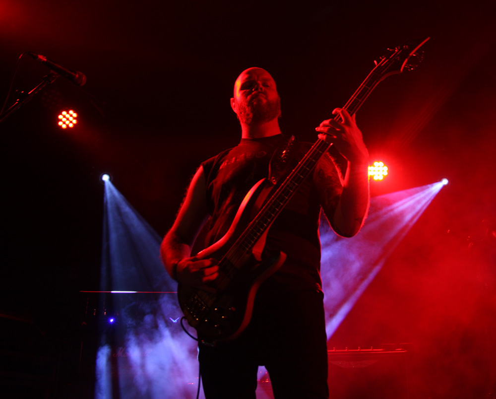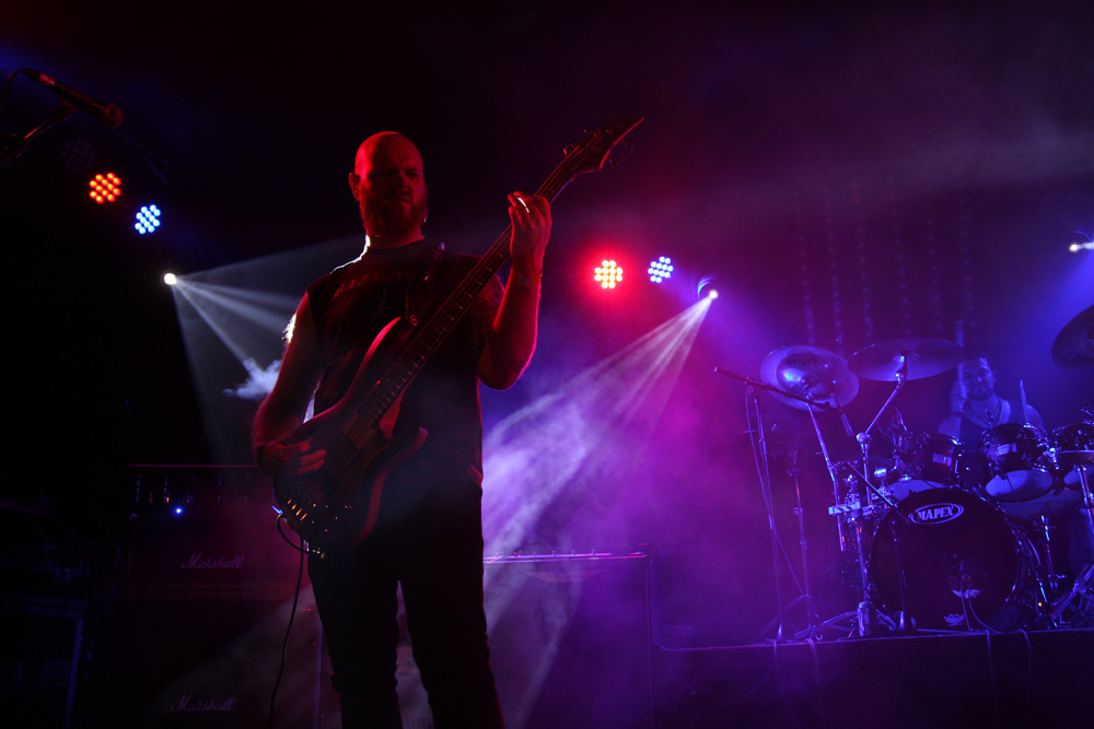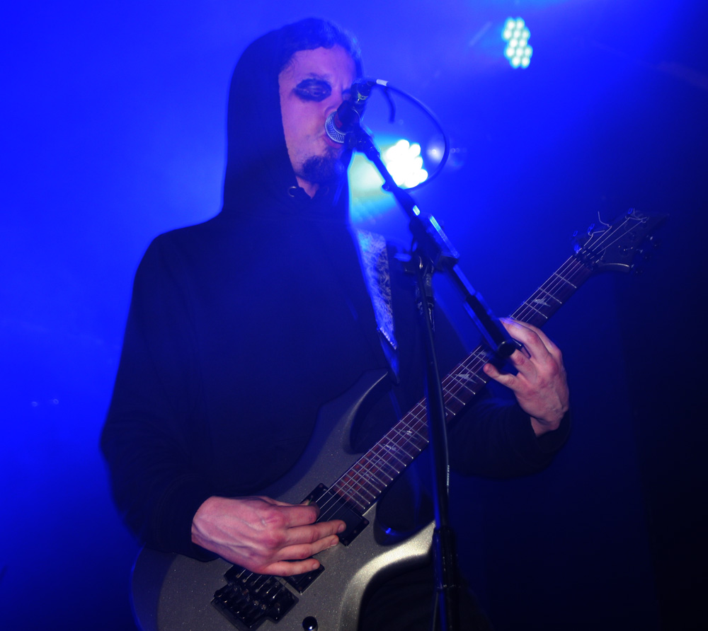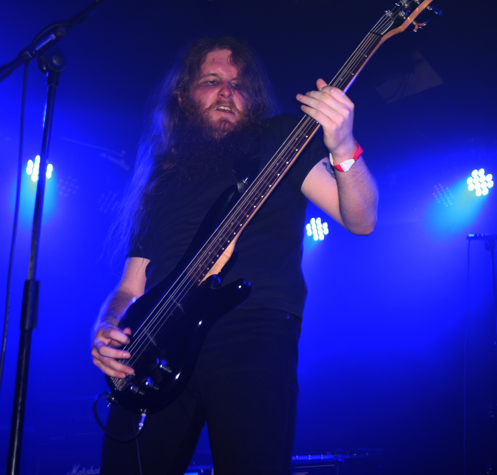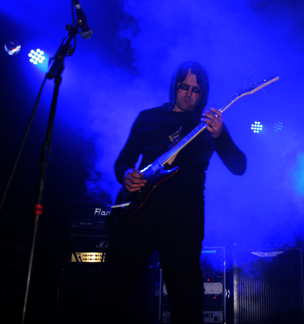 Like the openers Malthusian are still at the demo stage as far as recordings are concerned but that does not mean any hindering of quality. It starts with the caress of weighty doom, unsurprising as the band contains Mourning Beloveth and Wreck Of The Hesperus members in it. Guitars weep and it is cold blue and dead amidst the dry ice atmospherically on the stage. Then this storm breaks with churning, seething thunderous fury taking us into another dimension. It’s completely compelling and windswept as the craggy vocals join in and their ‘Plague Spoor’ is completely unleashed. It seems like they are playing effortlessly as they punish with a heaving lead-lined assault which sees the band fixed in position as they slow it down to a crawl. Shivering guitar parts intricately flail away and we are battered straight back into a virulent maelstrom. From doom to complete blackness this is a rigorous display of churning venom now, an epoch of Armageddon and with the front three all sharing the vocals the rafters were hit and almost toppled at levels that pretty much floored from the front to the back of the venue. The blue lighting was constant adding a malevolent atmosphere for which there was no let up. All that remained was the touch of cold death. If that sounds clichéd fair enough, for those of us soaking it up, it was anything but.