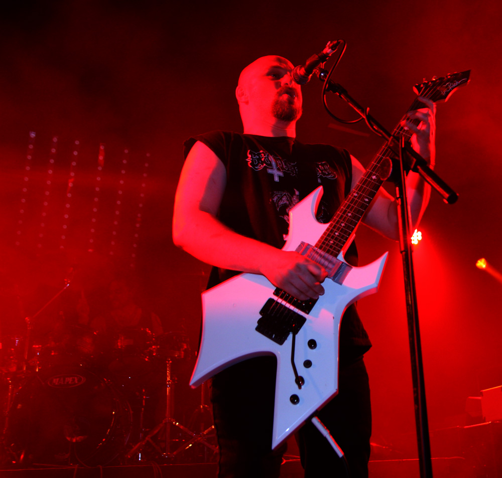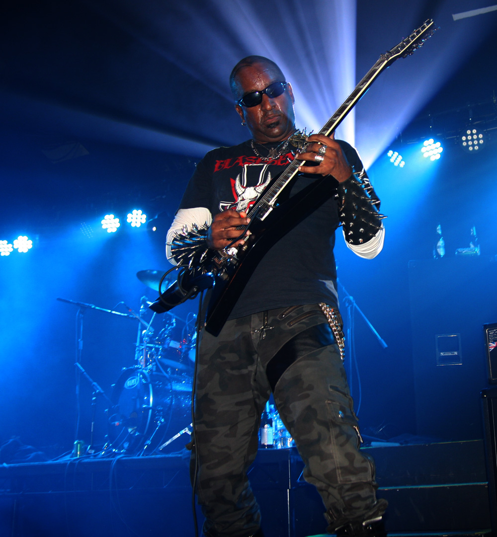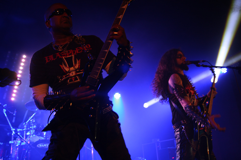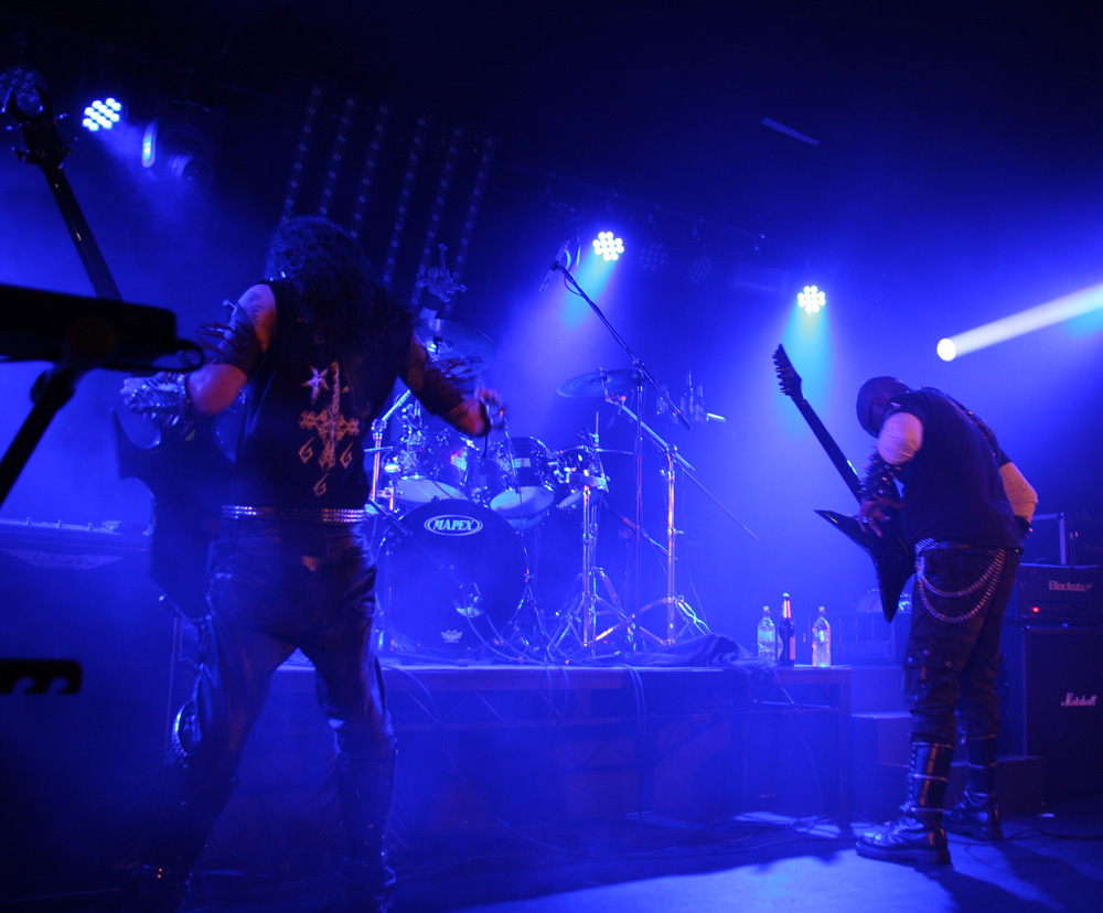 Songs about the end of Christianity add to the overall theme as spiky guitar work unleash the hate and vocals hit a necrotic croak. Defloration (The Antichrist Lives) foully oozes out the crypt and attacks evil cackles make it all the more stench ridden. A guest singer appears from somewhere and does a great job even if nobody quite knows who the hooded man was? It was rammed down the front and watching from the side with a much needed cold brew I wondered what on earth was going on as I could hear guitars but not see them. Ah Beelzeebubth is playing in the crowd, that explains it. Back on stage the command of “Destroy everything, kill your fucking selves” rang out. Err can we finish watching the show first please? Yes there was more left, the South Americans were not done with us yet carrying us across the threshold into the abyss for more magic and mayhem before leaving us spent knowing that this had been a very special ritual that would remain in the memory for some time to come.