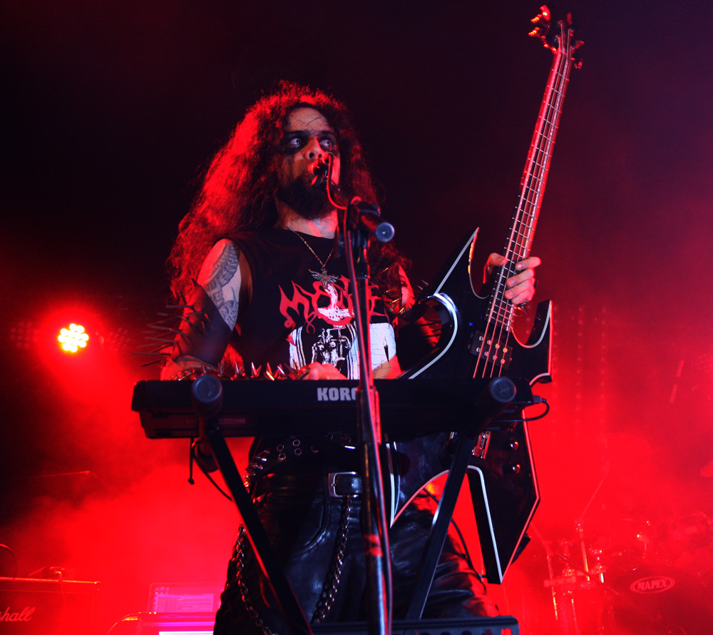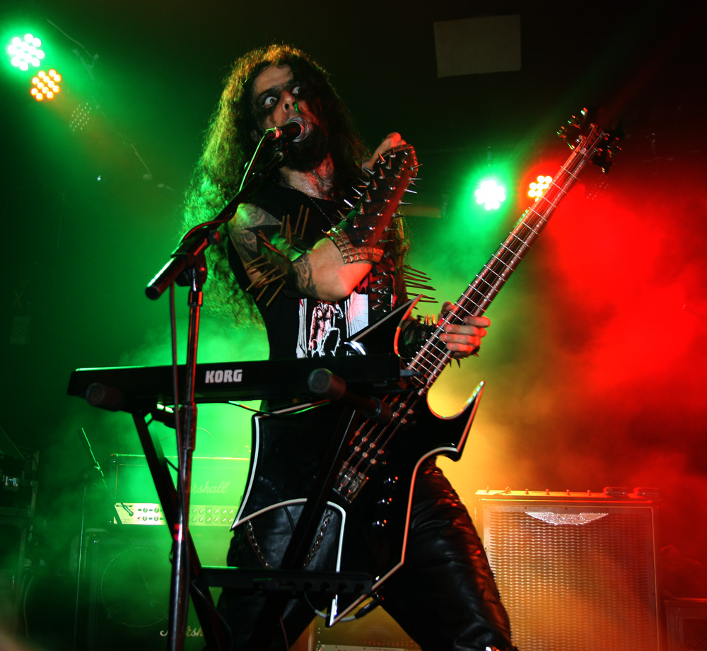I never could have guessed picking up a promo of Mystifier album ‘The World Is So Good…’ in a long defunct Soho record store that I would finally get the chance to see them 18 years later. Luckily the strange faux operatic black devil worship of that album did not put me off but there was none of that tonight as the band with one original member Beelzeebubth were dipping further back in time to play a 70 minute set of exclusive material from 1992 and 1993 albums Wicca and Göetia. After a long atmospheric build up with backs to us they eventually turn and face the highly anticipating crowd and unleash hell and thunder from the speakers. There is a razor sharp tightness about them despite the recent invocation of the drummer and lead vocalist / bassist into the band. Speaking of the latter Diego Araujo is a manic buzz of activity. The former Infested Blood man seems totally deranged as he juggles vocals with many a cackle and lunatic bark, keyboards and axe attack. It’s almost a show on its own just watching him. After flattening us with Osculum Obscenum we get a more theatrical and lunatic sermon in the form of An Elizabethan Devil-Worshipper’s Prayer Book slowing things down. Vocals snarl and bite and some fiery licks from the guitars add to the dark atmosphere conjured up.