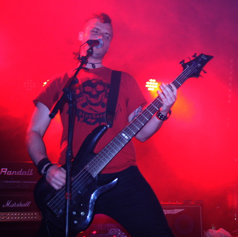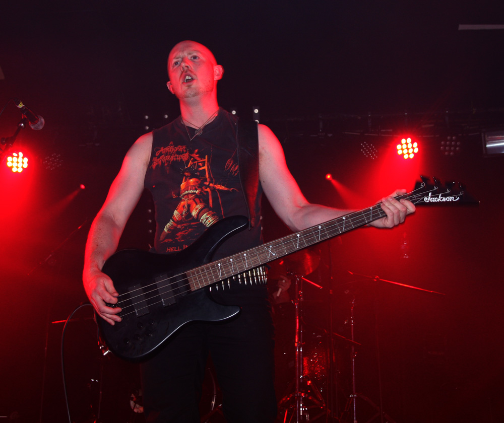 20 minutes between bands sees a mass exodus over the road and the off licence not knowing what hit it. Some no doubt decided to stay there but there was no time for that with the approach of the first performance from Spearhead in a few years. They project a completely different vibe both with much looser sound allowing us to hear things with much more definition rather than cloaking it all in impenetrable blackness and on stage too with lighting boosted right up. This is a band who want to be seen and heard! The technicality of the death laden assault shines through as a result and the likes of 2nd album title track ‘Decrowning The Irenarch’ remind just what a potent force this lot are. Barghest barks away vocally and pretty much commands and drums help lead the charge, battering away fast and furiously resulting in fist pumping action down the front. This is a more traditional form of death metal brutality and it feels somewhat more comfortable as a result. They always convey a sort of gladiatorial vibe having started out with a fixation to bygone Roman legions but now they seem to be playing in a more straight ahead fashion. You can at times note technical flourishes and twists that are reminiscent of Morbid Angel and the full force brutalism pulverises like the Polish hordes. It seems to get harder and faster as the set continues. Heads almost roll as barbed guitars attack and try to lop limbs off, the conclusion is like the last few minutes of a Game Of Thrones episode and just as satisfying. Good to see the band back!