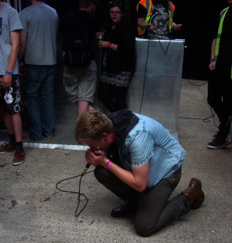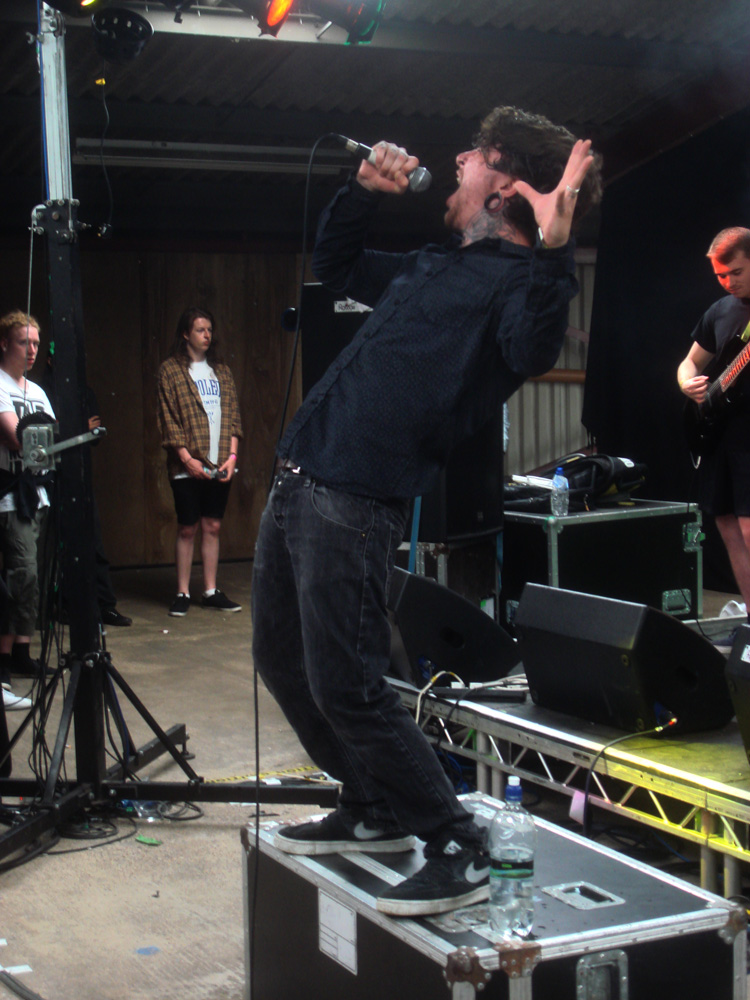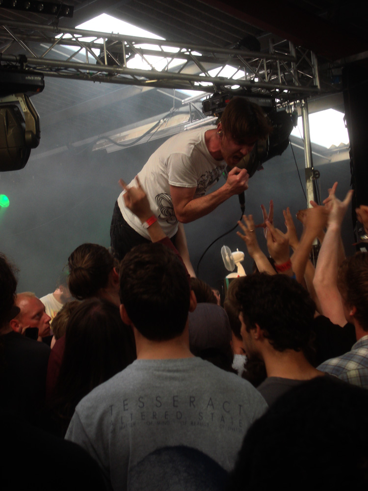 Thrown straight into the action, the first band up were Shields (7/10) who, accompanied by stage two’s mad lighting set-up (hangar-flooding strobes and big strip lights burning holes in retinas throughout), tore into their set with energetic abandon. The heaps of echo on vocalist Joe Edwards was as much to do with the spacious metal hangar as whatever delay had been added through the sound-desk. Edwards and floppy-haired guitarist Sam Kubrick’s wild stage antics (one bouncing whilst snapping his neck violently, the other shooting himself in the chin with his fingers as he sprayed out water) deserved better than being met with bleary-eyes and folded arms but their hefty, inventive metalcore grooves certainly set heads gently nodding.
