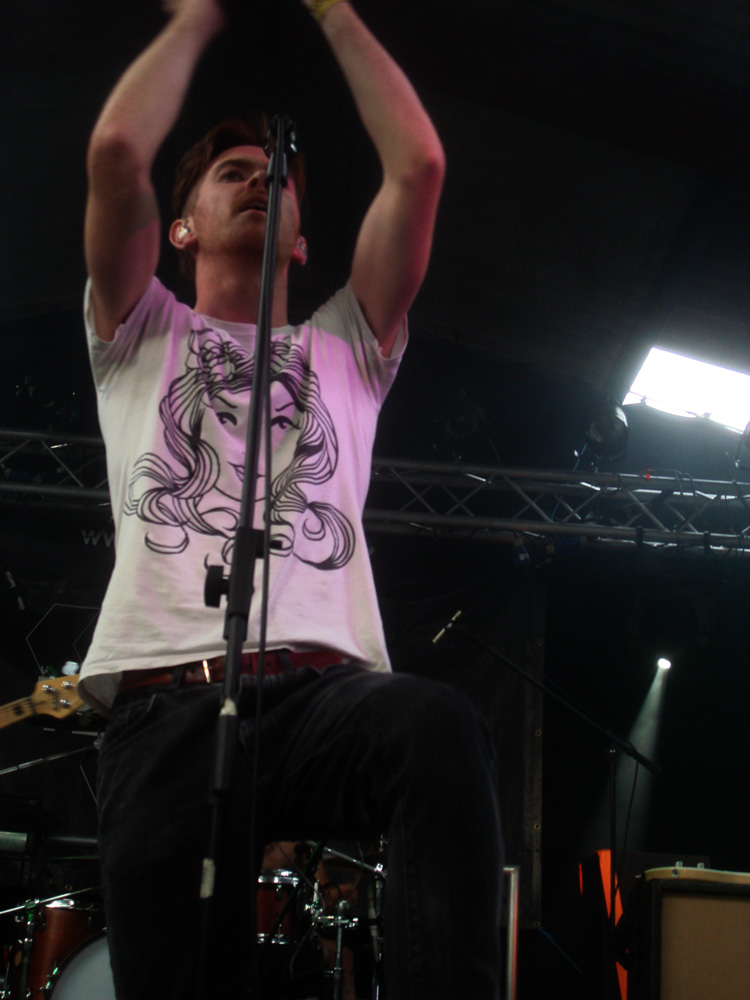 As Chicago trio Alaya (9/10) hit stage one, everything changed. So accomplished, tight and superbly emotive were they, that there was an instantaneous sense that the thrilling mayhem of the support acts had ended and the assured pomp of the headliners had begun. With stonkers like “Grace”, “Sleep” and “Poor Gloria” threading their way through the minds and mouths of the crowd, the soft floating cascades and arpeggios that surrounded the infectious choruses hit home and moved heads. With such little material to choose from there was a tendency for a mid-set slackening of impact, but with frontman Evan Graham Dunn literally bubbling over with enthusiasm (“We’re having the time of our lives at this festival. It’s been worth every dollar and every mile”) it was easy to become completely immersed in the performance.