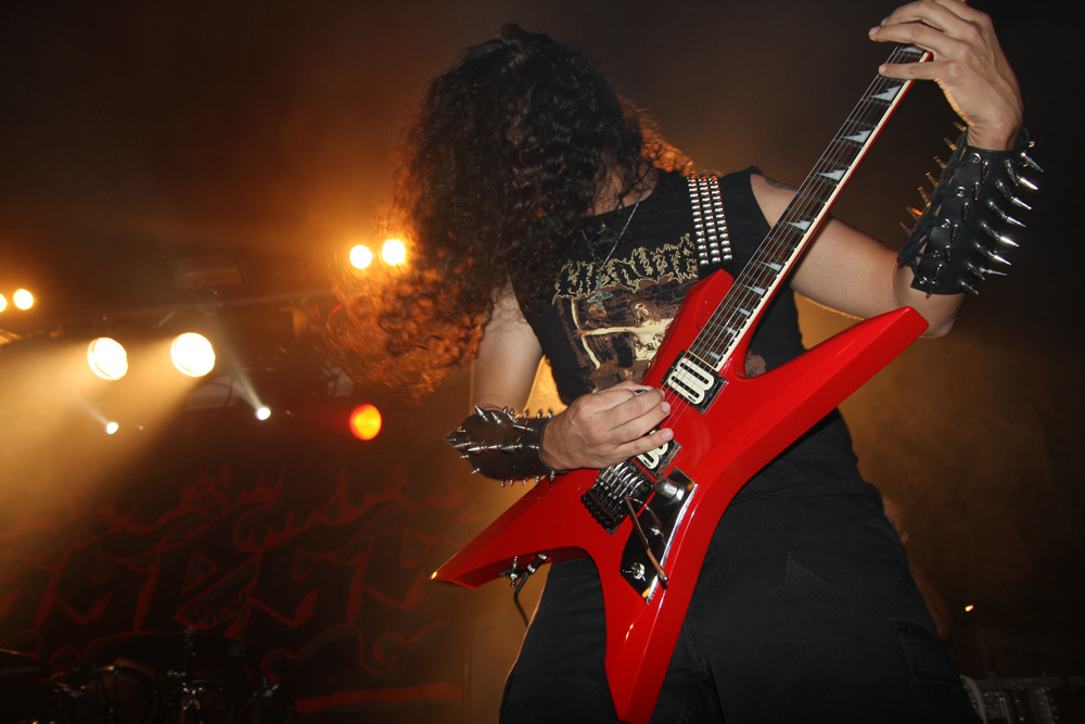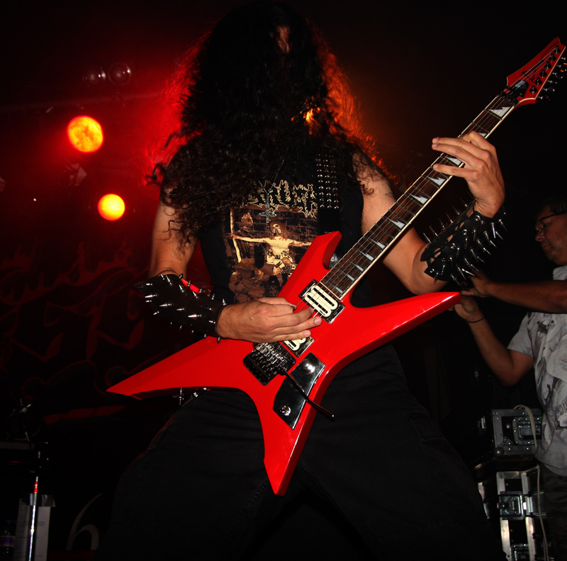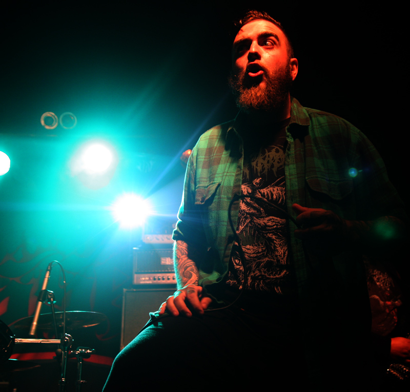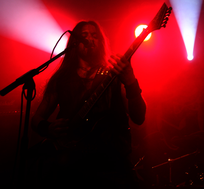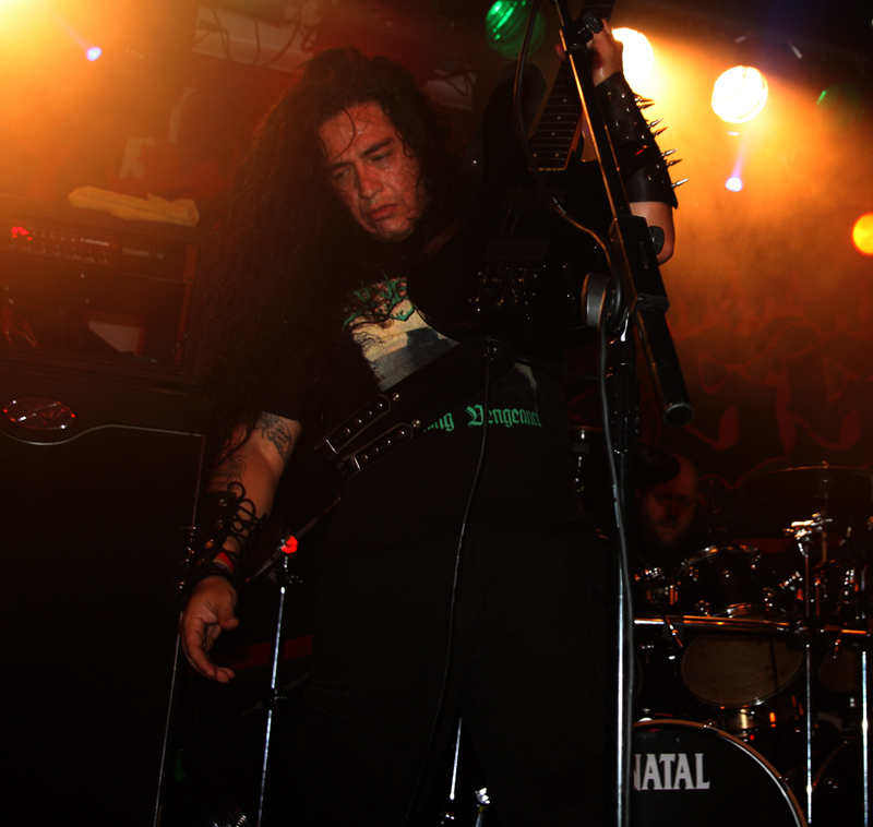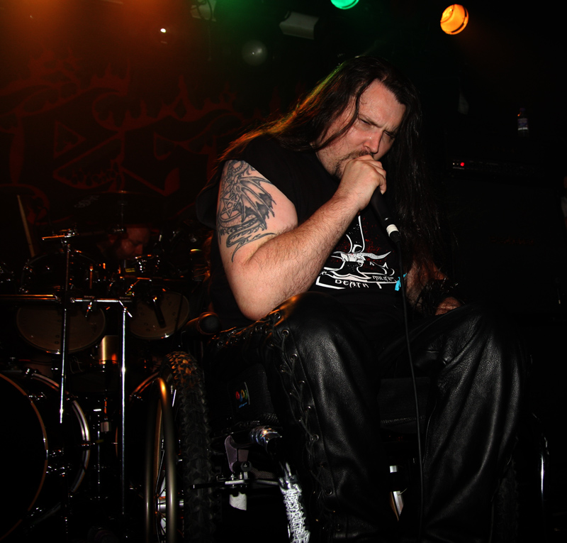 You could probably be forgiven for forgetting about and not hearing Possessed for quite some time. It was 1985-6 when their two highly regarded albums ‘Seven Churches’ and ‘Beyond The Gates’ came out. There have been break ups and reformations and founding member Jeff Becerra was shot in 1990 and has been in a wheelchair since then. This has not stopped him growling though and it is evident from the rammed venue that many have not forgotten the legacy of the band and tension is palpable as they prepare to take the stage. I was not sure how long since the band last played here, there is mention from some about an Electric Ballroom gig aeons ago and it sounded like Jeff tells us it has been 27 years since they were last here so no wonder the place is at fever pitch before hardly a note is struck. We are taken ‘Beyond The Gates’ and the place literally goes nuts. There are many clustered on the side of the stage, hair is twirling everywhere and it takes no time for the first person to go over the barrier. It’s virtually anarchic in here and Jeff looks like he is loving every minute of it as he growls away whilst the rest of the band dig in and play furiously. Time is kept in fashion as they have none other than Nick Barker behind the kit, bass is thick, guitars sharp and the sound fantastic. Songs like EP number ‘The Eyes Of Horror’ are short sharp and furious mixing gnarly death with full on thrashing madness. Lead guitar work spirals away and literally scorch from front to back of venue.