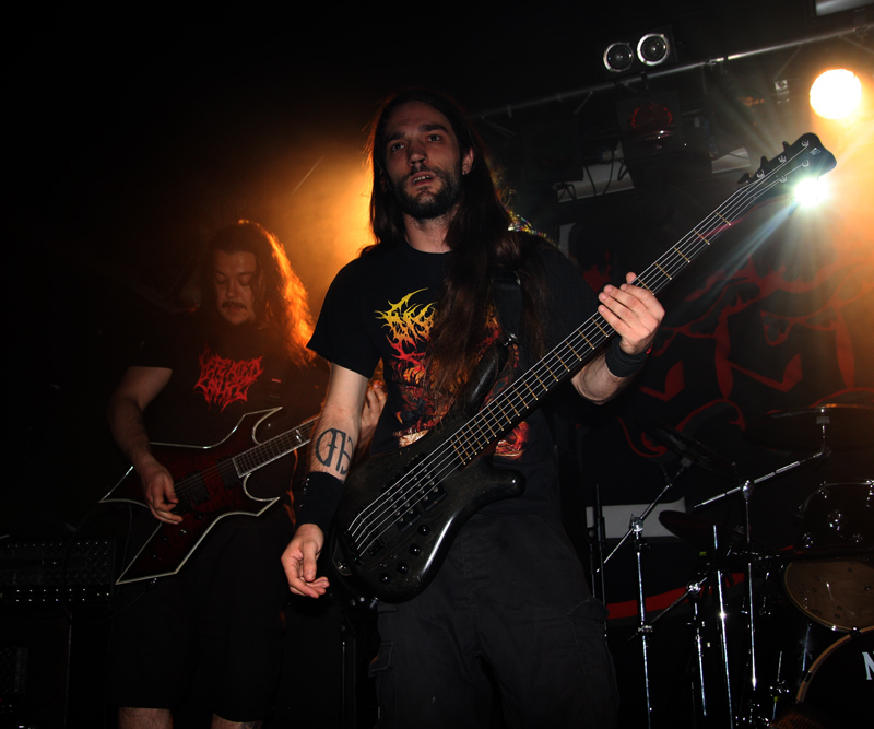 If you had not encountered anything in the way of death metal since the headliners had released their two classic albums you would have wondered just what had happened in the last 3 decades for it to evolve into what we were being battered senseless with courtesy of opener Unfathomable Ruination. Containing members from the likes of Cerebral Bore, Fleshrot and Prostitute Disfigurement this was never going to be pretty! With drum kit pushed right forward they seem particularly in the face as the get their slam on with rumbling bass, churning guitars and chundering vocals. Song titles like ‘Suspended In Entropic Dissipation’ probably make sense to any medical deviants in the audience and as the vocals are grunted and gurgled out by the band’s new vocalist Ben Wright a few are happy to wreck away on the dance-floor no doubt feeling guilty that he had just described earlier efforts as resembling a jazz club! Despite the unrelenting fury of the musicians the technicality of the windmilling riffs as they squall and squeal is duly noted. There’s a certain amount of grind amidst ‘Pantheonic Synchroscheme,’ rugged chops and elongated vocal bellows much to the delight of the fans of the band. The rest of us looked on, suitably warmed up after this punishing half hour assault.