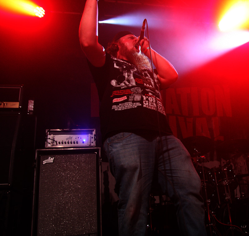 First up on our radar after a quick visit to a boat down the road for a couple of beers, which has become a bit of a tradition are Amputated. It’s a breakfast of champions for many and the Terrorizer stage is suitably rammed straight away clearly to the delight of the brutally sick deathsters who promise to lower the tone in style. It’s not difficult for them to do so in fact the track titles alone are enough to leave you gagging if you are of a sensitive disposition. With the likes of ‘Cunt Like A Sewer’ and ‘Repugnant Genital Deformity’ spewed, gurgled, squealed and slammed out someone best get the University nurse on hand as it’s like a description of the aftermath of Freshers week in here! The sound is suitably thick and beefy and the musical brutality is viciously honed and destructive. Between songs it’s pretty ribald with some good banter between fans and band who are after certain songs being aired. It’s a case of “tough shit that’s not on the list but this one is” as they batter us straight back to first album ‘Gargling With Infected Semen’ with Anally Disembowelled (Weapons of Ass Destruction) and seriously you couldn’t make titles like this up. We are also urged to go and check out a new video for next number ‘When Whores Meet Saws’ which succeeds in getting the first pit of the day; it certainly won’t be the last.