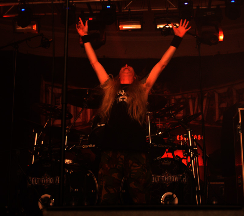 Half way into their set and some decisions had to be made as this festival was massively over sold for the capacity of just running two stages at a time and that meant with the main room capacity being around 2000 and with nigh on 4000 in attendance (that total reflects capacity if every stage is running at the same time I believe so someone needs some arithmetic lessons) it was announced a one in one out policy would run for Bolt Thrower’s set meaning I had to decide whether to stay and watch Cannibal Corpse in full and risk not getting in to see Bolt Thrower which was not easy to make as Cannibal Corpse were ferocious and continued with “Scourge Of Iron” from the “Torture” album, but not before George berated the crowd for not headbanging enough, after which I made my sloth like exit towards the main stage for Bolt Thrower, via the merch area to buy a Cannibal Corpse tour shirt. (MH)