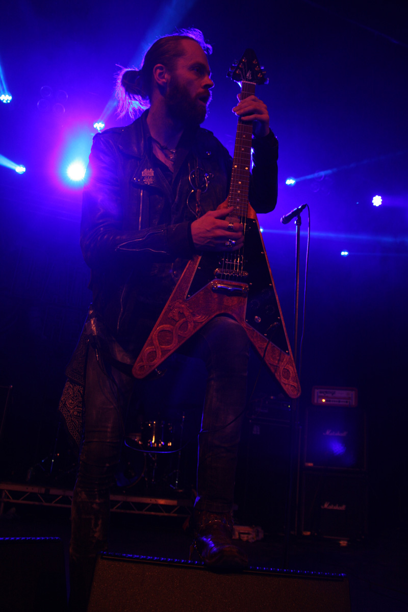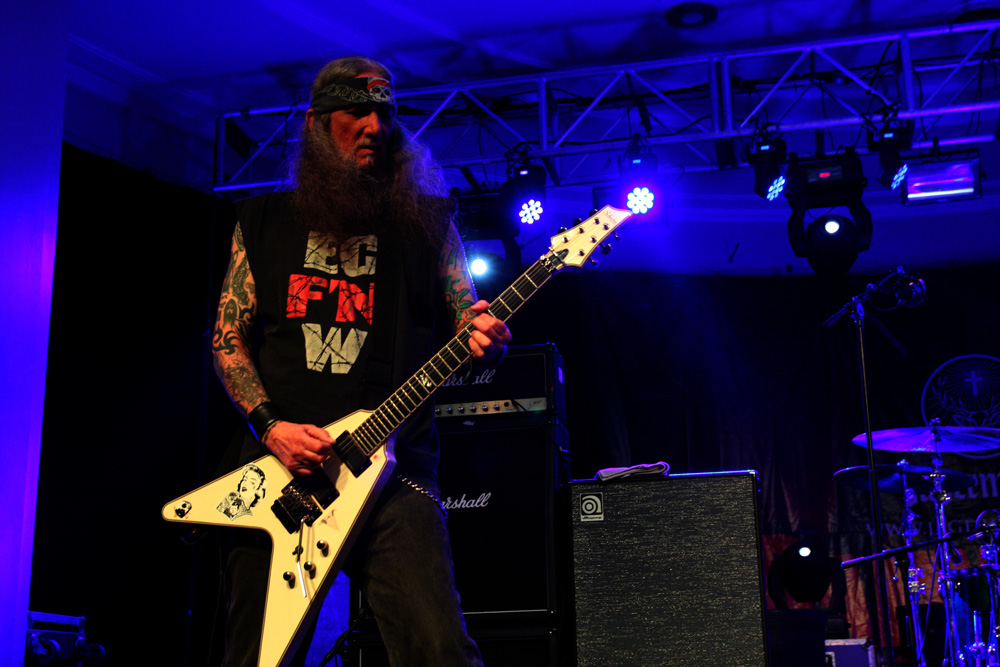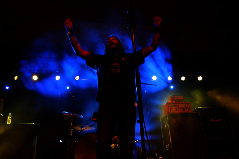 Even just shambling on stage, doom legends Saint Vitus wear every inch of their mileage on their tattooed bodies. Veterans doesn’t come close to the road wars these guys have seen. Alas my perch to the side under the balcony means I can understand not one word that is spoken from the stage, however if I’m not mistaken (though I usually am) they open with ‘Living Backwards’ from V and that guitar sound is just… ah, well it’s just Saint Vitus. Looking like a strange biker goblin, Wino clutches the microphone stand and that voice howls out. We get a fine shot at ‘Bleed Black’, and unexpected but heart wrenching rendition of the brilliant ‘Let Them Fall’ and the punk days revisited of ‘White Stallions’. It’s a packed crowd who respond well and get into it all easily, being treated to a performance that you do wonder if they could just crank out anywhere from a car park to an embassy. It’s not that this is by any stretch mechanical, but they really have been there, done that, got the tattoo and the road rash and are still standing and there’s an inscrutable quality to them these days. A feeling that you will never know if they are really enjoying it and how much because, after all this time, this is the skull they look out from and it betrays nothing. Closing with ‘Born Too Late’ having done most of that album by my count, the crowd thins as people leave to book their place at Cannibal Corpse but Saint Vitus don’t care. They are survivors and if only for ‘White Stallions’ and ‘Let Them Fall’, they delivered the goods. (Gizmo)